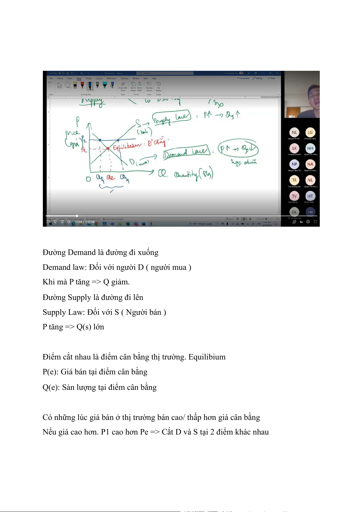 Đường Demand là đường đi xuống Demand law: Đối với người D ( người mua ) Khi mà P tăng => Q giảm. Đường Supply là đường đi lên Supply Law: Đối với S ( Người bán ) P tăng => Q(s) lớn Điểm cắt nhau là điểm cân bằng thị trường. Equilibium P(e): Giá bán tại điểm cân bằng Q(e): Sản lượng tại điểm cân bằng Có những lúc giá bán ở thị trường bán cao/ thấp hơn giá cân bằng Nếu giá cao hơn. P1 cao hơn Pe => Cắt D và S tại 2 điểm khác nhau. Tài liệu được sưu tầm và soạn thảo dưới dạng file PDF để gửi tới các bạn cùng tham khảo, ôn tập đầy đủ kiến thức, chuẩn bị cho các buổi học thật tốt. Mời bạn đọc đón xem!