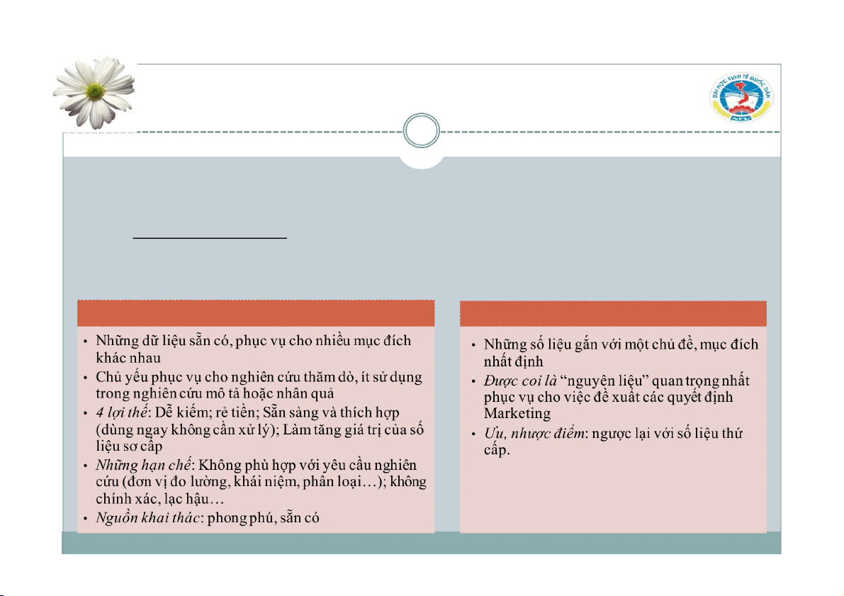 • Ưu, nhược điểm: ngược lại với số liệu thứ liệu sơ cấp cấp.
