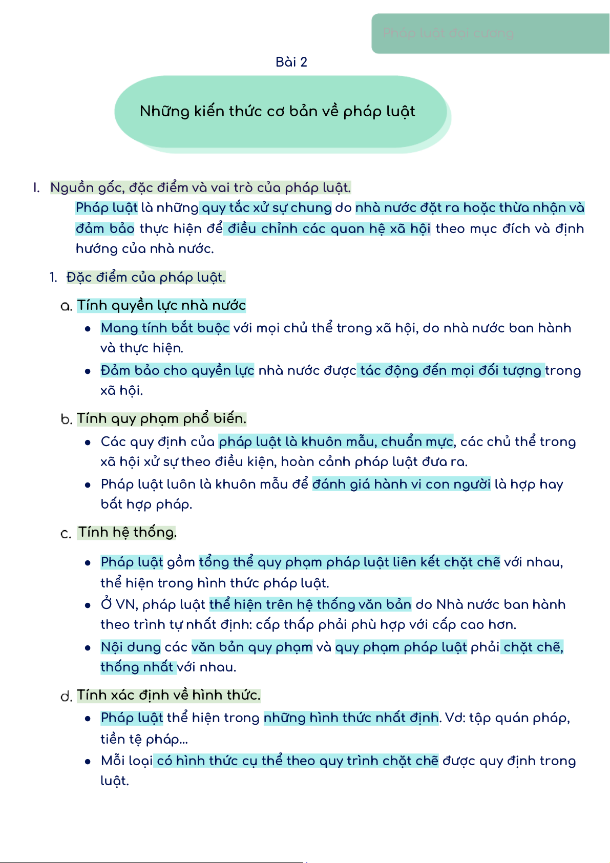 I. Nguồn gốc, đặc điểm và vai trò của pháp luật.