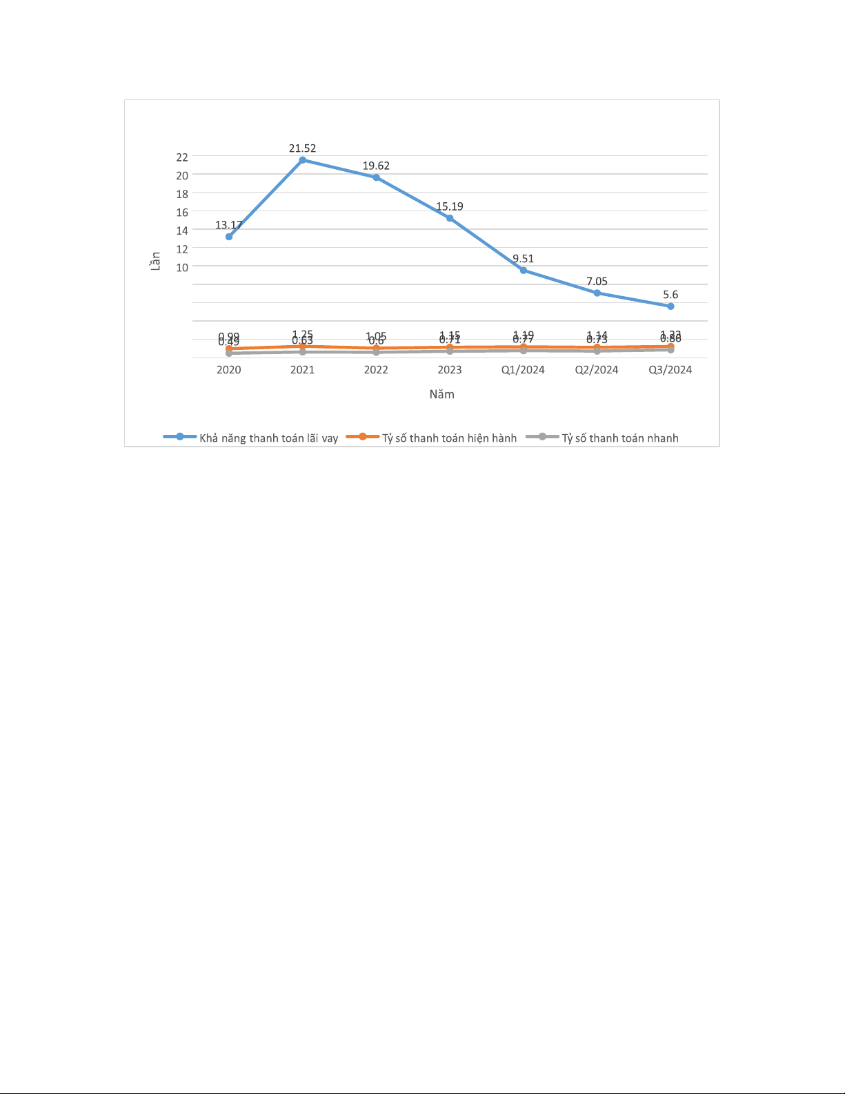 Giai đoạn 2024: Khả năng thanh toán lãi vay giảm mạnh từ 9,51 (Q1) xuống 5,6 (Q3).