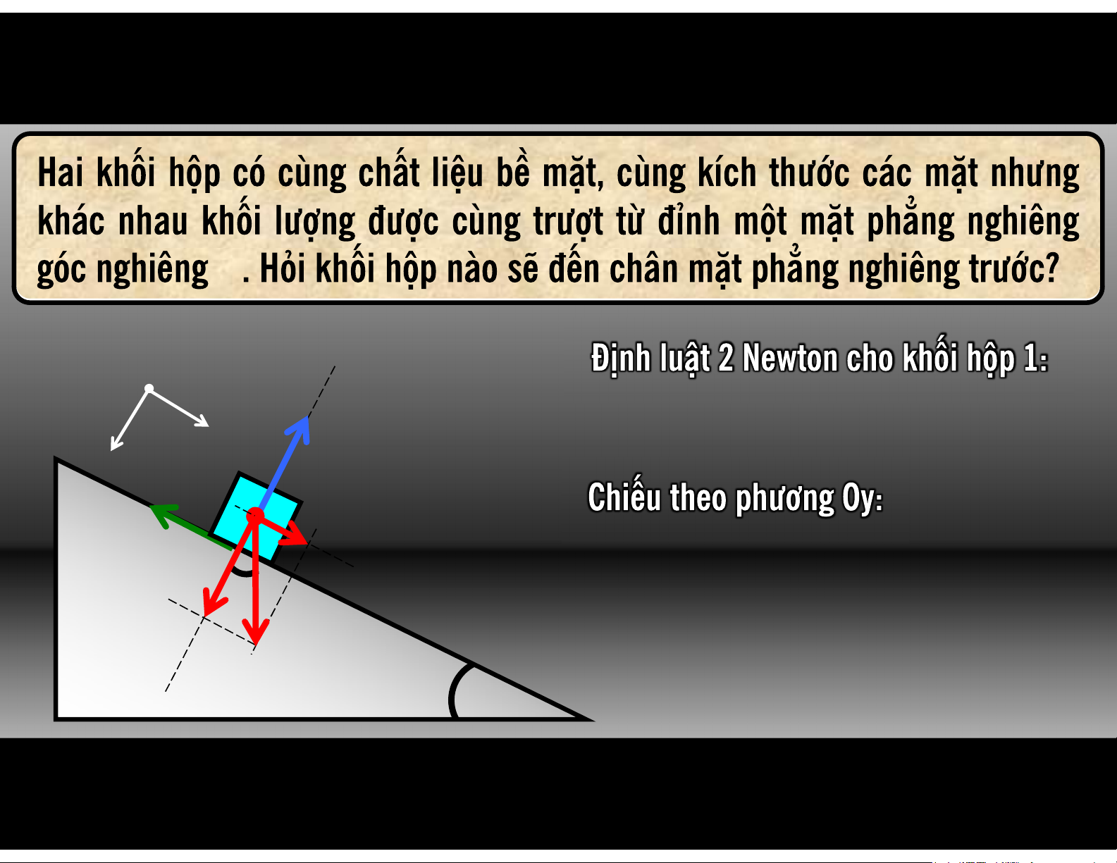 CHƯƠNG 3 Fi = 0 v = const DẠNG TỔNG QUÁT: ma = F i i dv BIỂU DIỂN THEO v: m = Fi dt i 2 d r BIỂU DIỂN THEO r: m = F 2 i dt i LỰ L C C MA M A S ÁT Á T TR T Ư R ỢT A B C Fms trượt = ktrượt.N LỰ L C C MA M A S ÁT Á T NG N HỈ A B C BÀ B I ITẬ T P Ậ P M IN I H H HỌ H A α N1 F P ms1 1x x P 1y P1 α BÀ B I ITẬ T P Ậ P M IN I H H HỌ H A α O x y N P + N + F = m a 1 1 ms1 1 1 1 F P ms1 1x α -N + P = 0 1 1y P -N + P cosα = 0 1y P 1 1 1 α -N + m gcosα = 0 1 1 N = m gcosα 1 1 BÀ B I ITẬ T P Ậ P M IN I H H HỌ H A α O x N1 P - F = m a 1x ms1 1 1 y F P P .sinα - k.N = m a ms1 1x α x 1 1 1 1