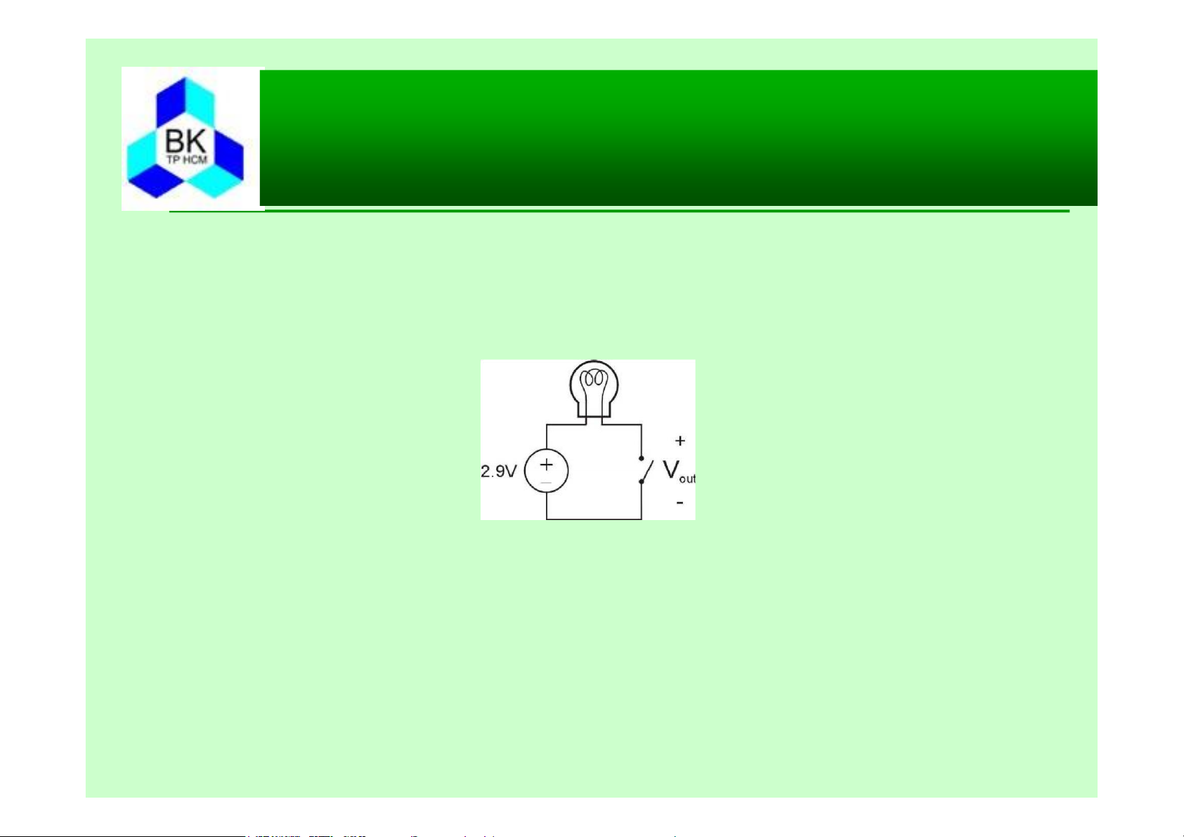 Khi khóa đóng, có dòng chạy qua mạch, đèn sáng, điện thế Vout = 0V,