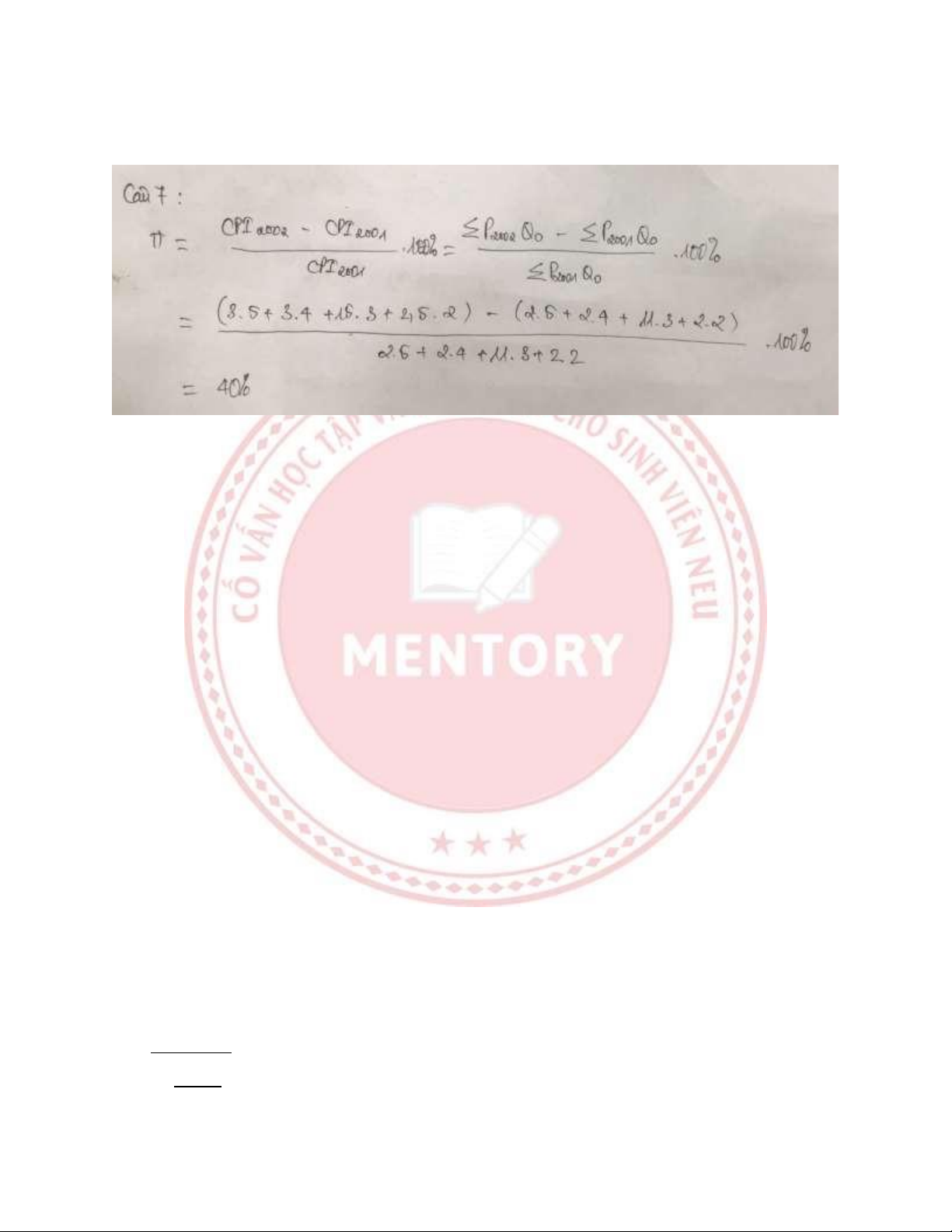 trong giai đoạn từ năm thứ hai đến năm thứ ba Giải thích: t πt − CPIt−1 = CPI x 100%. CPIt−1 100−90 𝐶 = ∗ 100% = 11,1% 1 90 2 95−100 𝐶 = ∗ 100% = -5%. 2 100 3