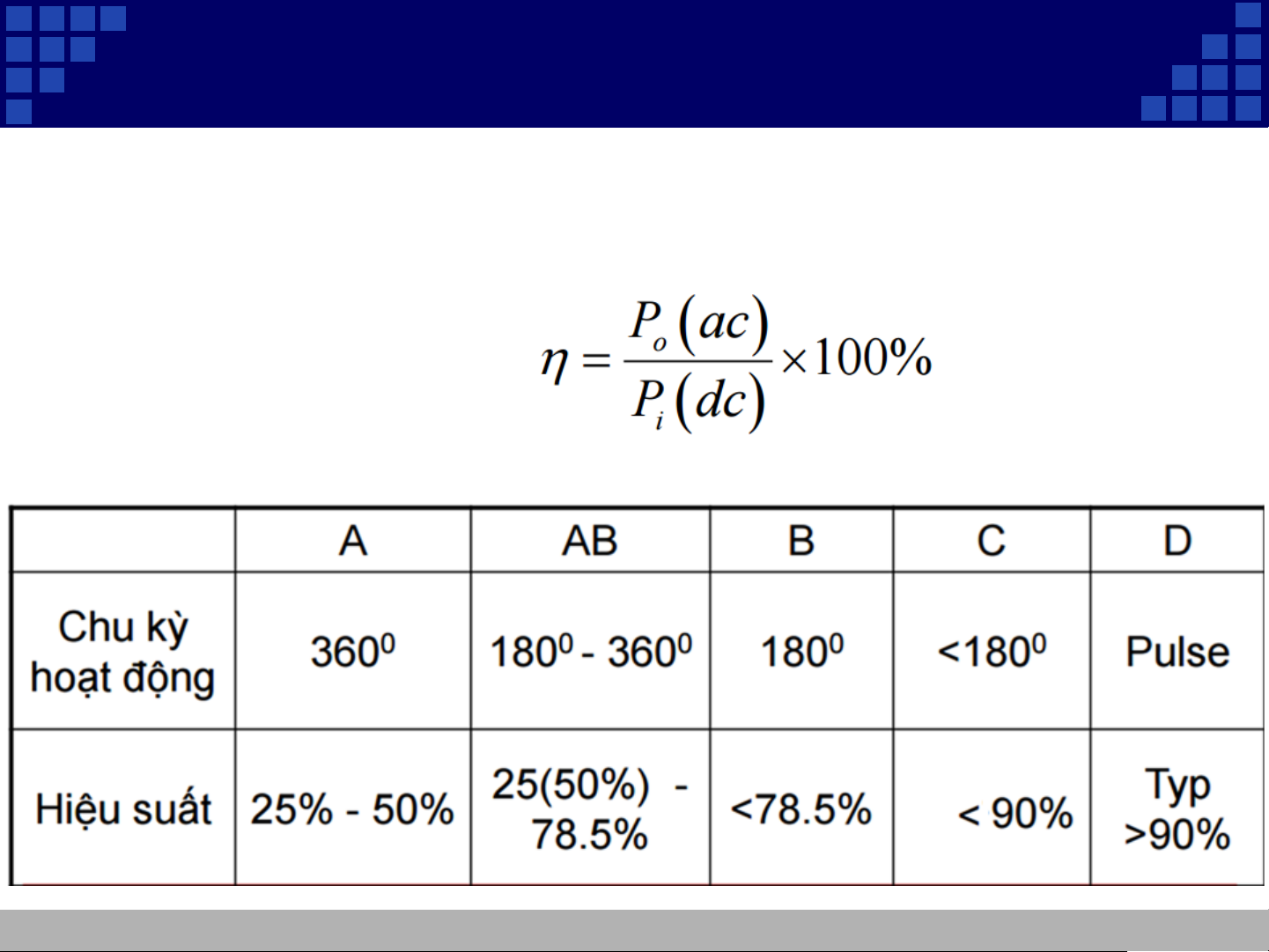 ❖ Hiệu suất = công suất xoay chiều trên tải/ công suất cung cấp từ nguồn DC.