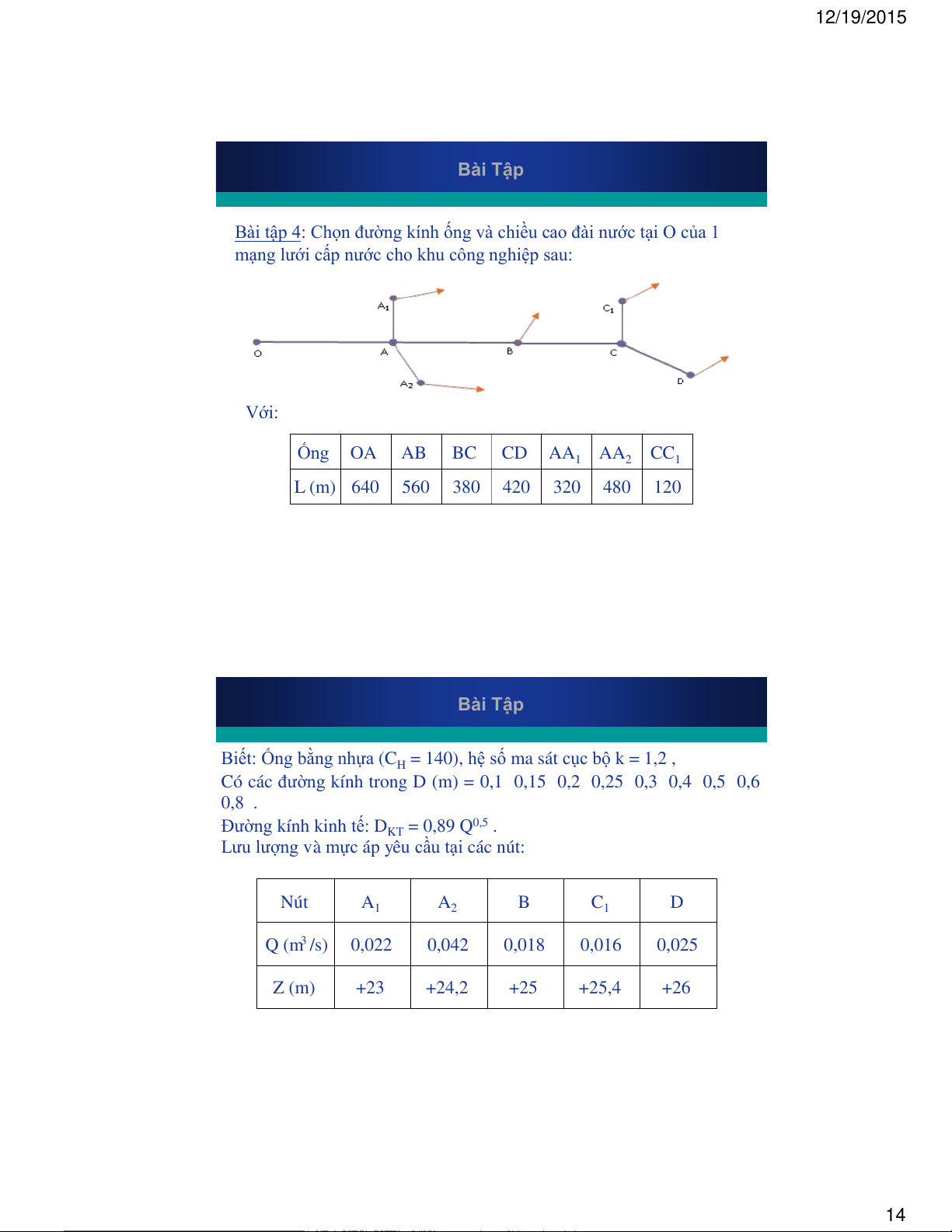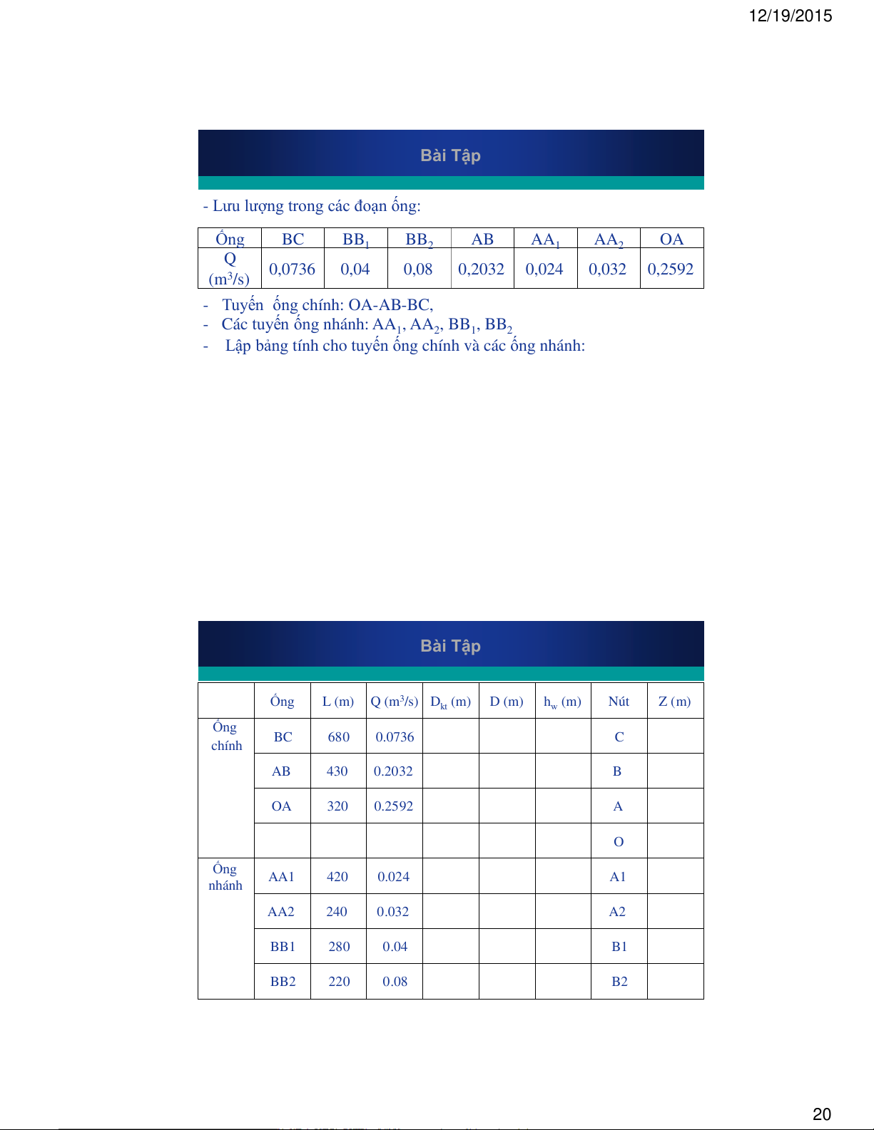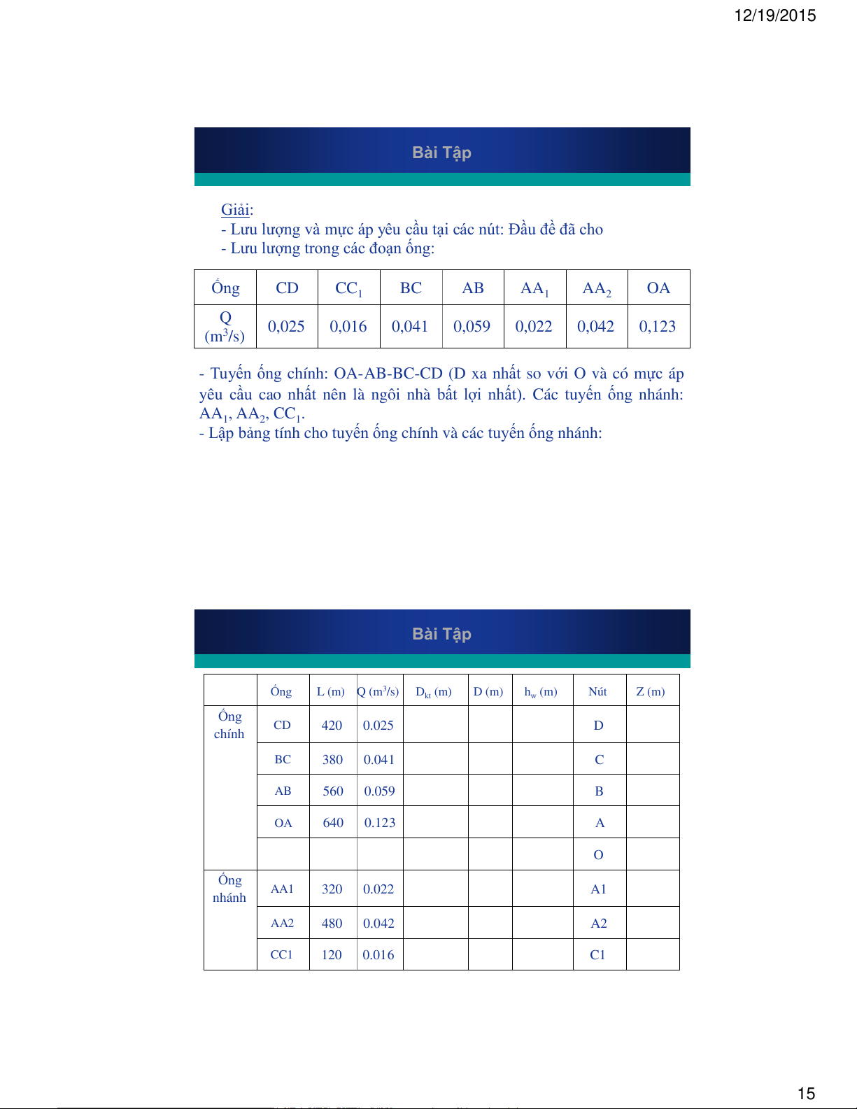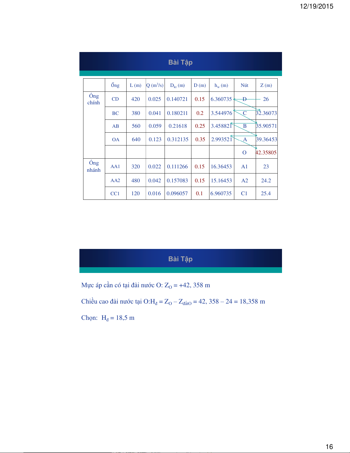 - Lập bảng tính cho tuyến ống chính và các tuyến ống nhánh: Bài Tập Ống L (m) Q (m3/s) Dkt (m) D (m) hw (m) Nút Z (m) Ống chính CD 420 0.025 D BC 380 0.041 C AB 560 0.059 B OA 640 0.123 A O Ống nhánh AA1 320 0.022 A1 AA2 480 0.042 A2 CC1 120 0.016 C1 15 12/19/2015 Bài Tập Ống L (m) Q (m3/s) Dkt (m) D (m) hw (m) Nút Z (m) Ống chính CD 420 0.025 0.140721 0.15 6.360735 D 26 BC 380 0.041 0.180211 0.2 3.544976 C 32.36073 AB 560 0.059 0.21618 0.25 3.458821 B 35.90571 OA 640 0.123 0.312135 0.35 2.993521 A 39.36453 O 42.35805 Ống nhánh AA1 320 0.022 0.111266 0.15 16.36453 A1 23 AA2 480 0.042 0.157083 0.15 15.16453 A2 24.2 CC1 120 0.016 0.096057 0.1 6.960735 C1 25.4 Bài Tập