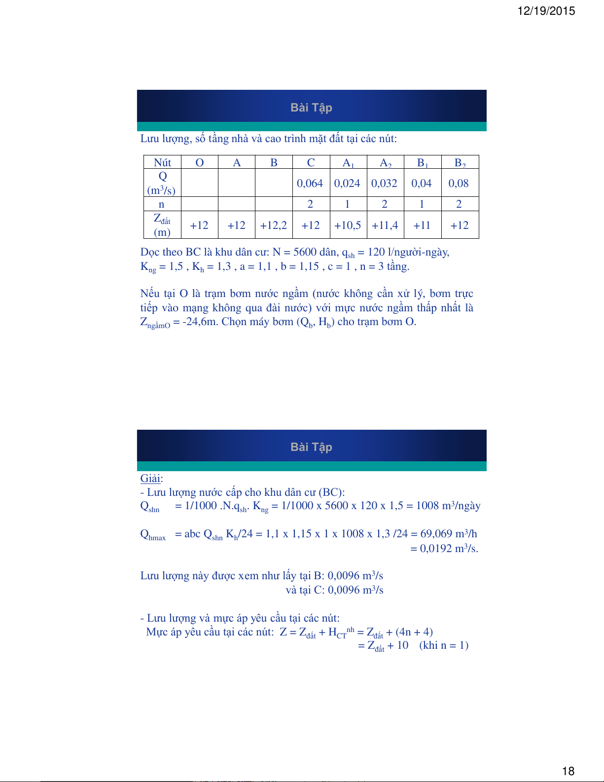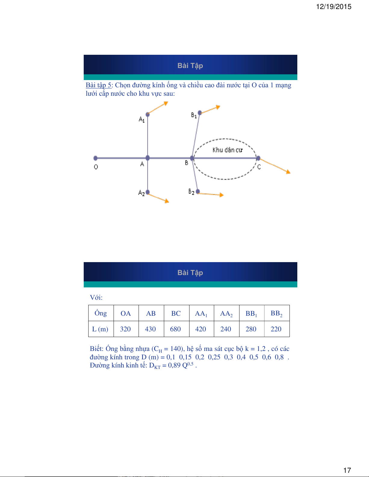 Chiều cao đài nước tại O:H = Z = 42, 358 đ O – ZđấtO – 24 = 18,358 m Chọn: H = 18,5 m đ 16 12/19/2015 Bài Tập