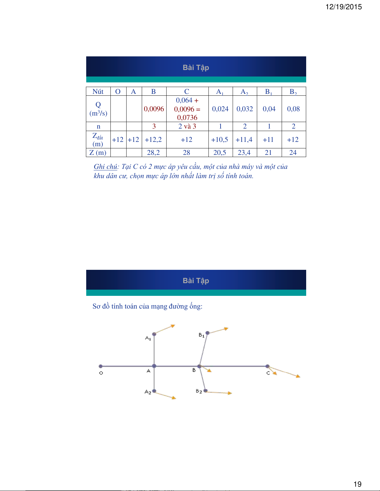 Mực áp yêu cầu tại các nút: Z = Z + H nh CT = Z + (4n + 4) đất đất = Zđất + 10 (khi n = 1) 18 12/19/2015 Bài Tập Nút O A B C A1 A2 B1 B2 Q 0,064 + (m3/s) 0,0096 0,0096 = 0,024 0,032 0,04 0,08 0,0736 n 3 2 và 3 1 2 1 2 Zđất (m) +12 +12 +12,2 +12 +10,5 +11,4 +11 +12 Z (m) 28,2 28 20,5 23,4 21 24