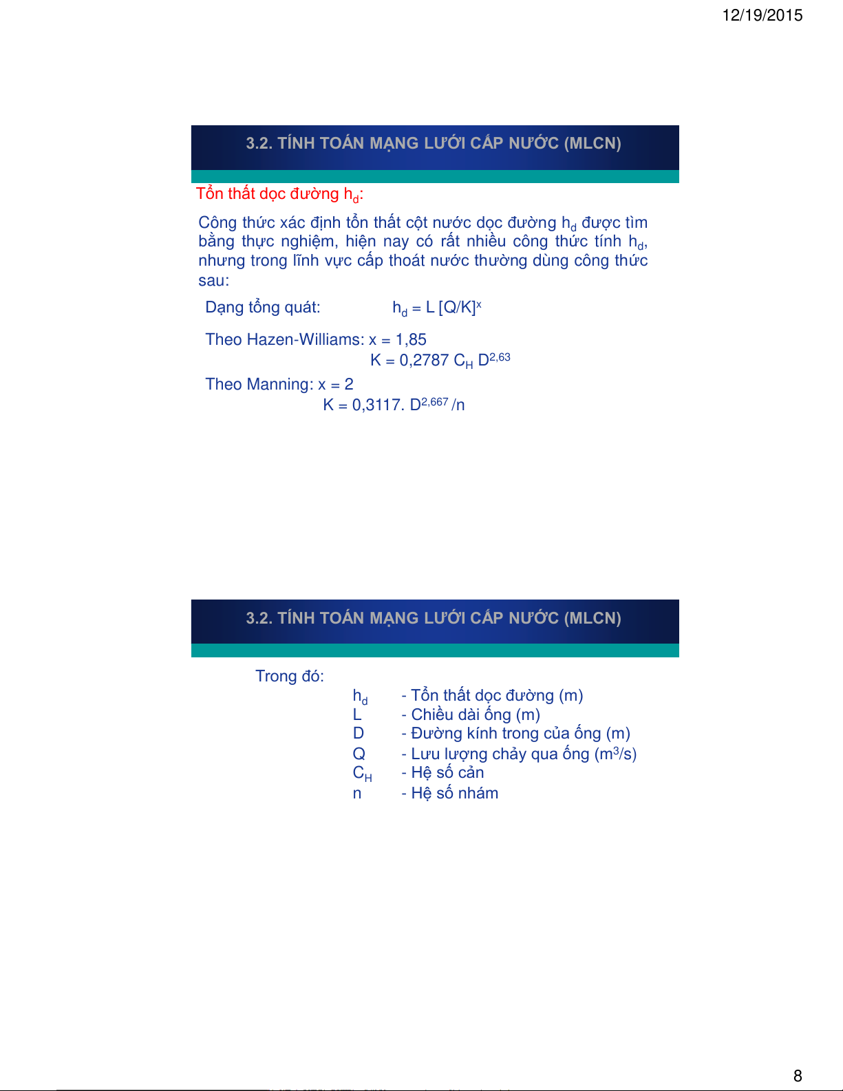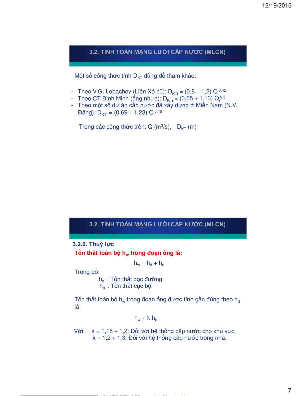 3.2. TÍNH TOÁN MẠNG LƯỚI CẤP NƯỚC (MLCN) Trong đó: hd