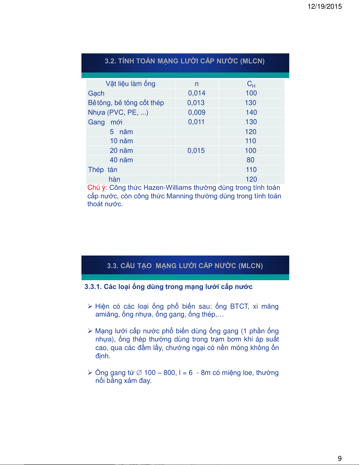 cấp nước, còn công thức Manning thường dùng trong tính toán thoát nước.