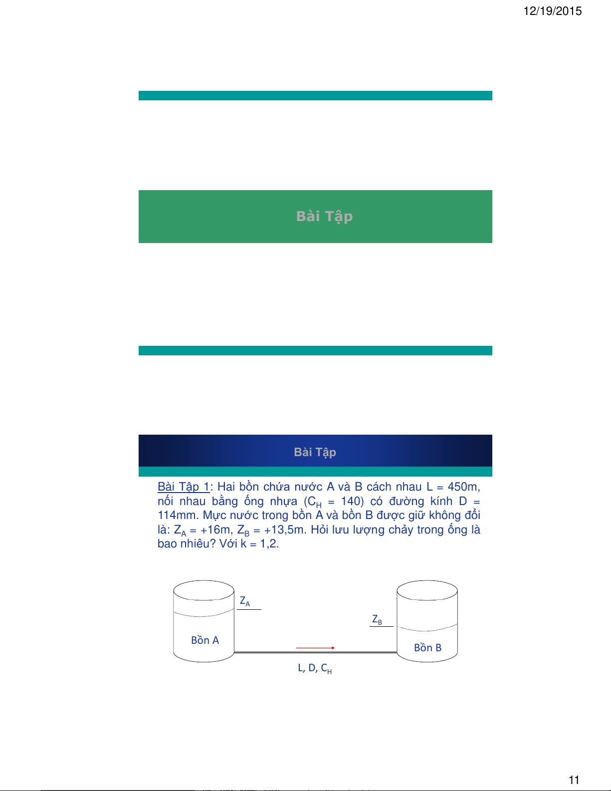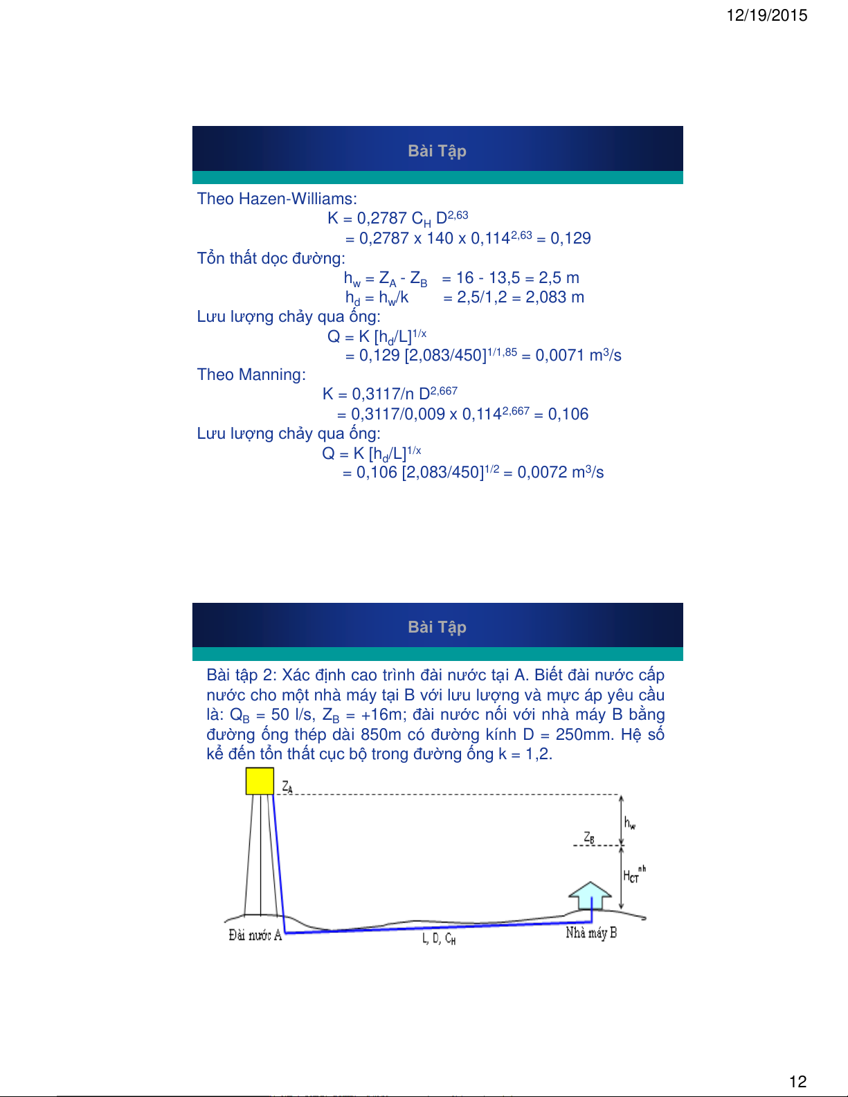 là: ZA = +16m, ZB = +13,5m. Hỏi lưu lượng chảy trong ống là bao nhiêu? Với k = 1,2. ZA ZB Bồn A Bồn B L, D, CH 11 12/19/2015 Bài Tập Theo Hazen-Wil iams: K = 0,2787 CH D2,63