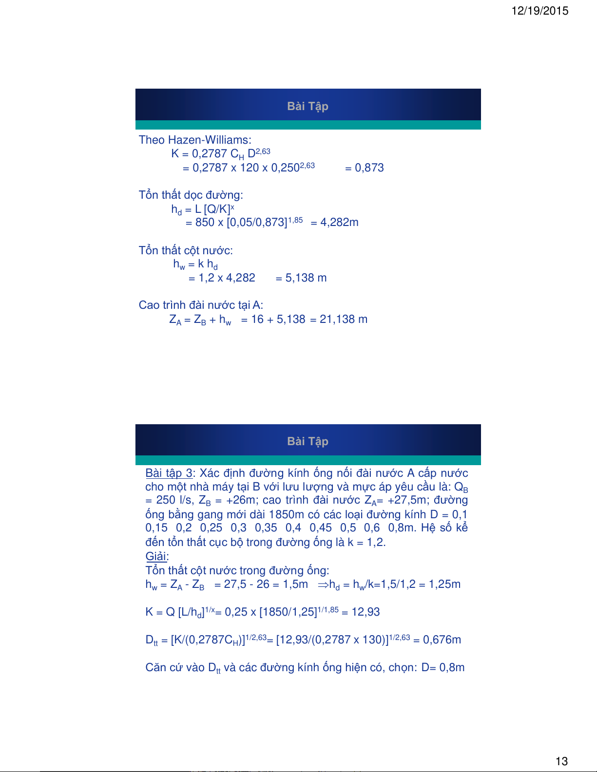 kể đến tổn thất cục bộ trong đường ống k = 1,2. 12 12/19/2015 Bài Tập Theo Hazen-Wil iams: K = 0,2787 CH D2,63 = 0,2787 x 120 x 0,2502,63 = 0,873 Tổn thất dọc đường: hd = L [Q/K]x