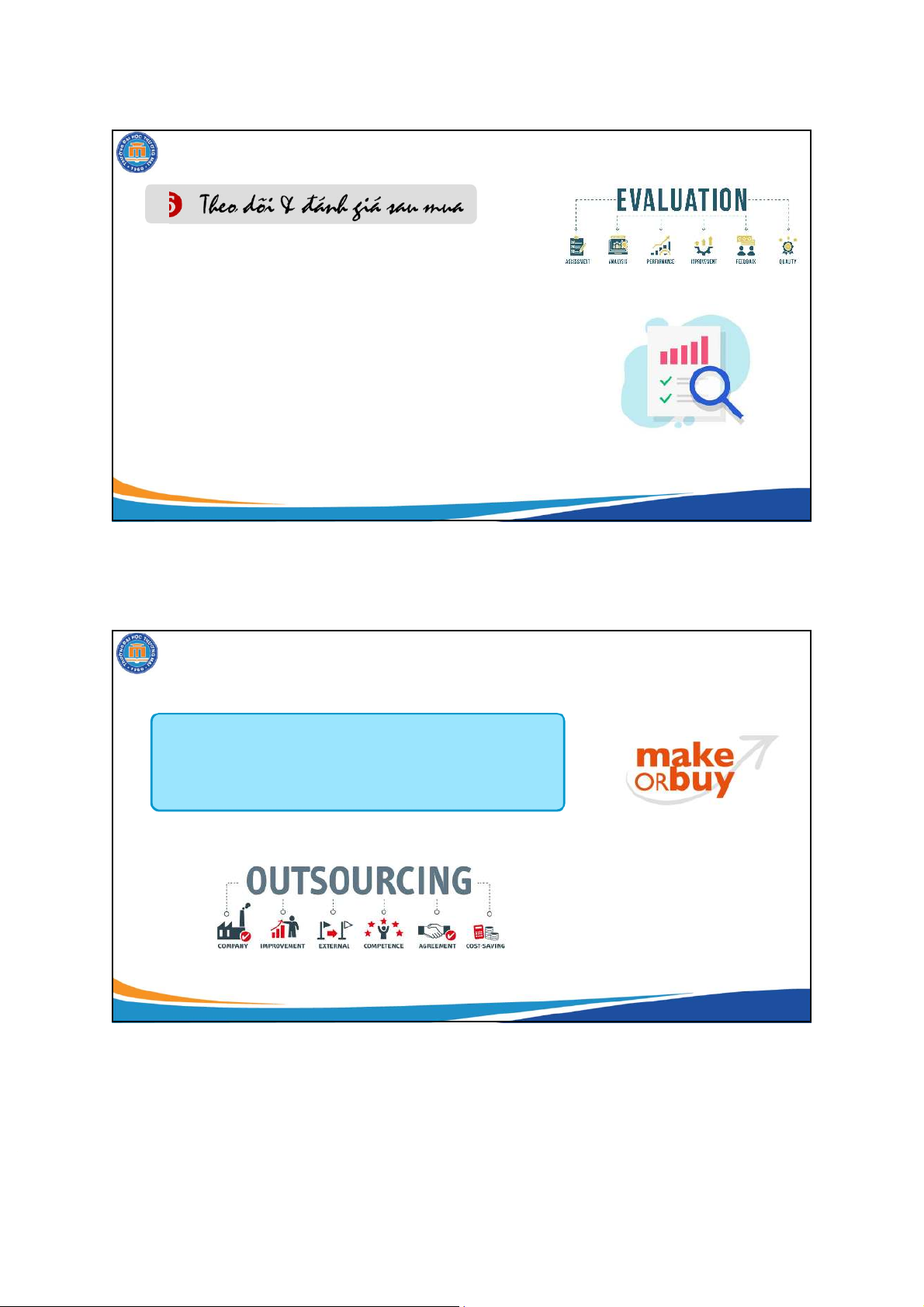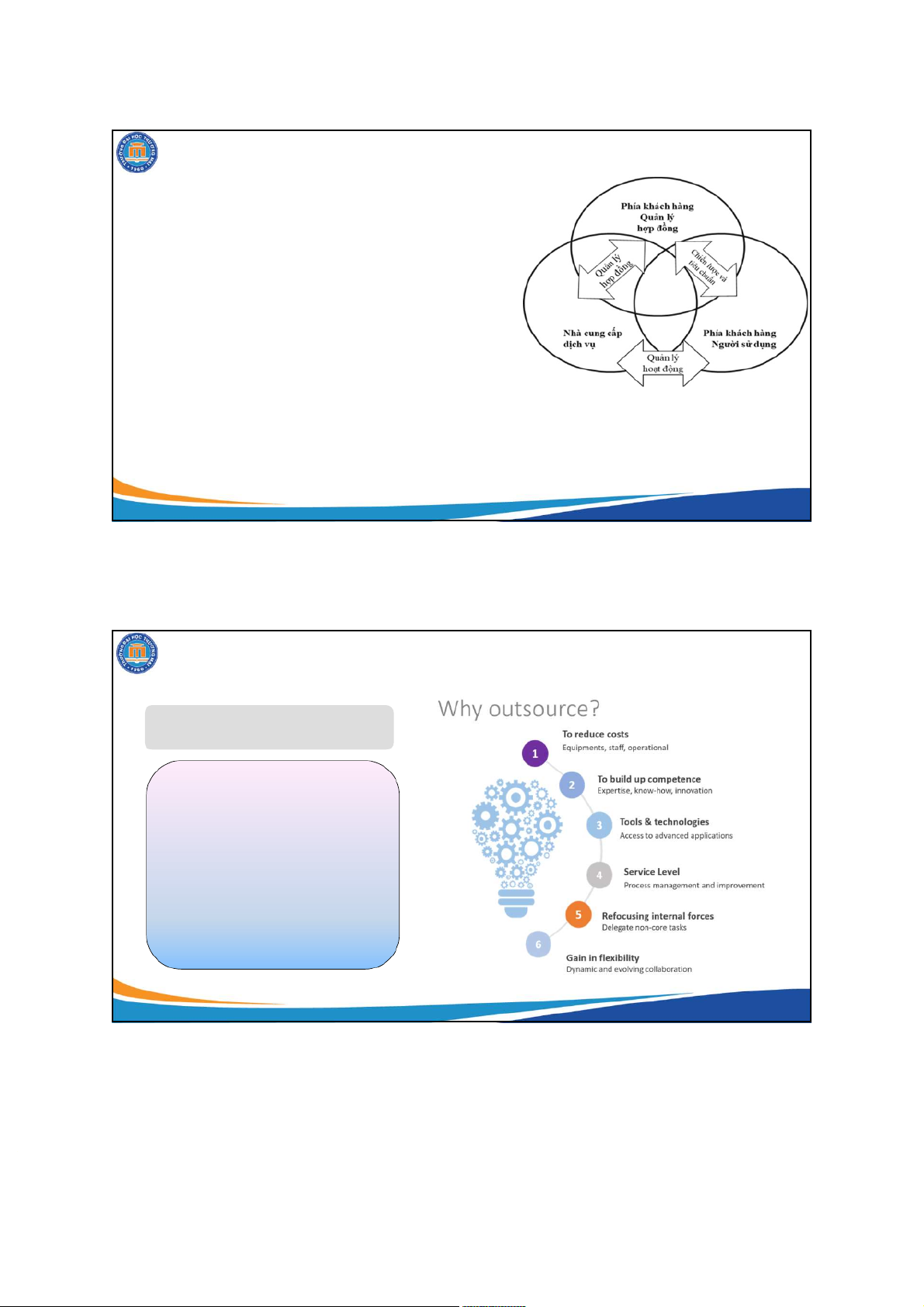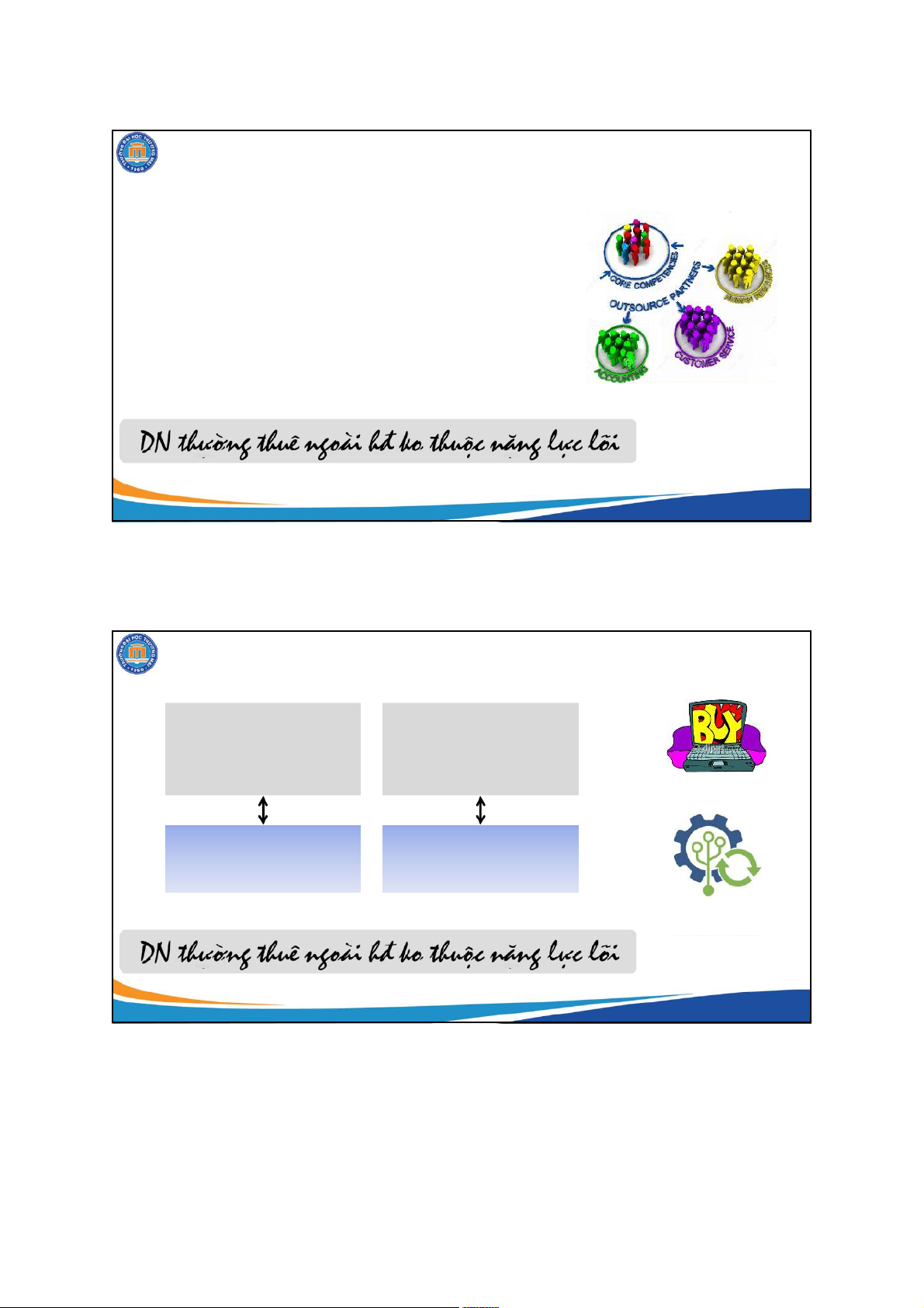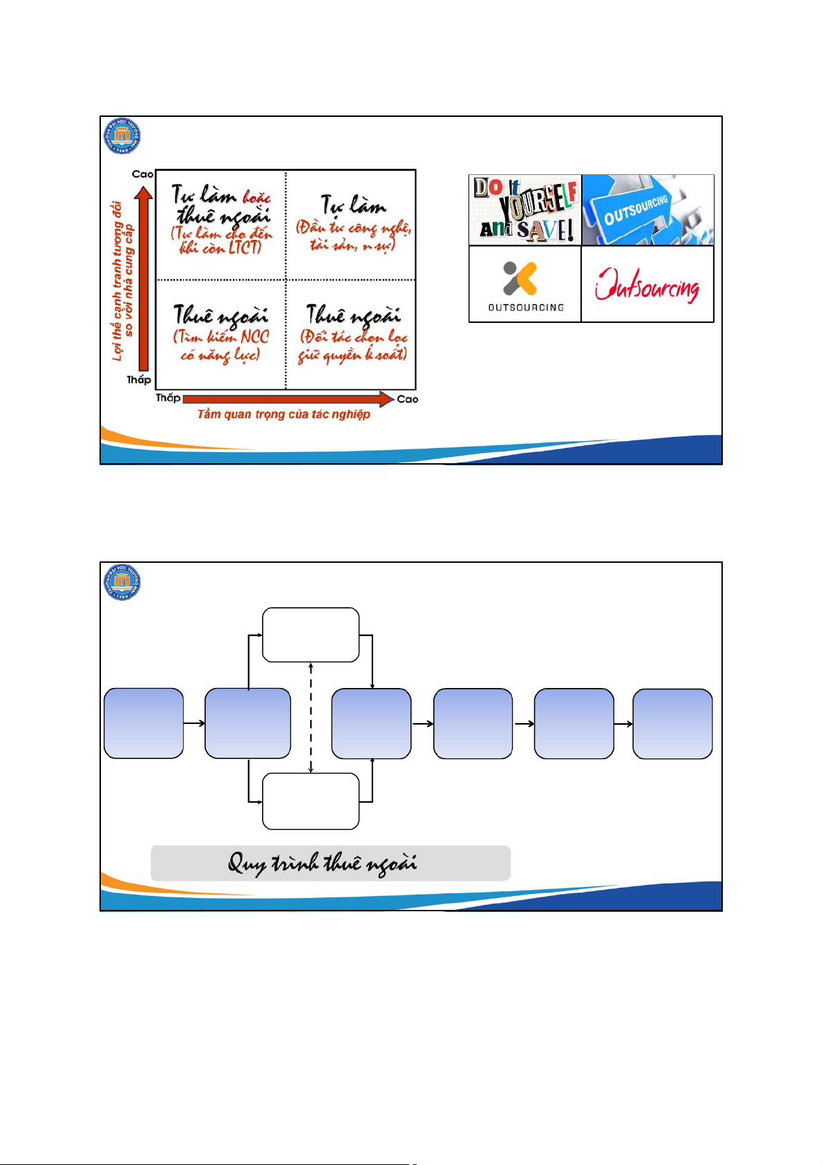 (chức năng) đối với sự triển khai chức năng thành công của DN cụ thể Quy mô & mức độ ổn định Công nghệ, tài sản & năng lực quản lý 15 21/8/2024 3. 3 2 . . 2 2 . 2 C ă C n ă n c ứ c ứ t h t u h ê u ê n g n o g à o i à 31 3. 3 2 . . 2 3 . 3 Q u Q y u y t r t ì r n ì h n h t h t u h ê u ê n g n o g à o i à i 32 Tiềm năng cung ứng bên ngoài Đánh giá Đấu thầu Đánh giá Lựa chọn thị trường Lựa chọn Quản lý lại nội bộ mối q.hệ cung ứng phù hợp NCC NCC hoặc tự bên ngoài thực hiện Nhu cầu & ưu tiên của DN 16 21/8/2024 3. 3 2 . . 2 3 . 3 Q u Q y u y t r t ì r n ì h n h t h t u h ê u ê n g n o g à o i à i 33 1. Đánh giá nội bộ & nhu cầu thuê ngoài 2. Đánh giá thị trường cung ứng 3. Lựa chọn mối quan hệ phù hợp 3. 3 2 . . 2 3 . 3 Q u Q y u y t r t ì r n ì h n h t h t u h ê u ê n g n o g à o i à i 34 4. Lựa chọn NCC (thầu phụ) 5. Quản lý NCC 6. Đấu thầu lại hoặc tự thực hiện 17 21/8/2024 3. 3 3 . 3 Q u Q ả u n ả n l ý l ý n g n u g ồ u n ồ n c u c n u g n g 35