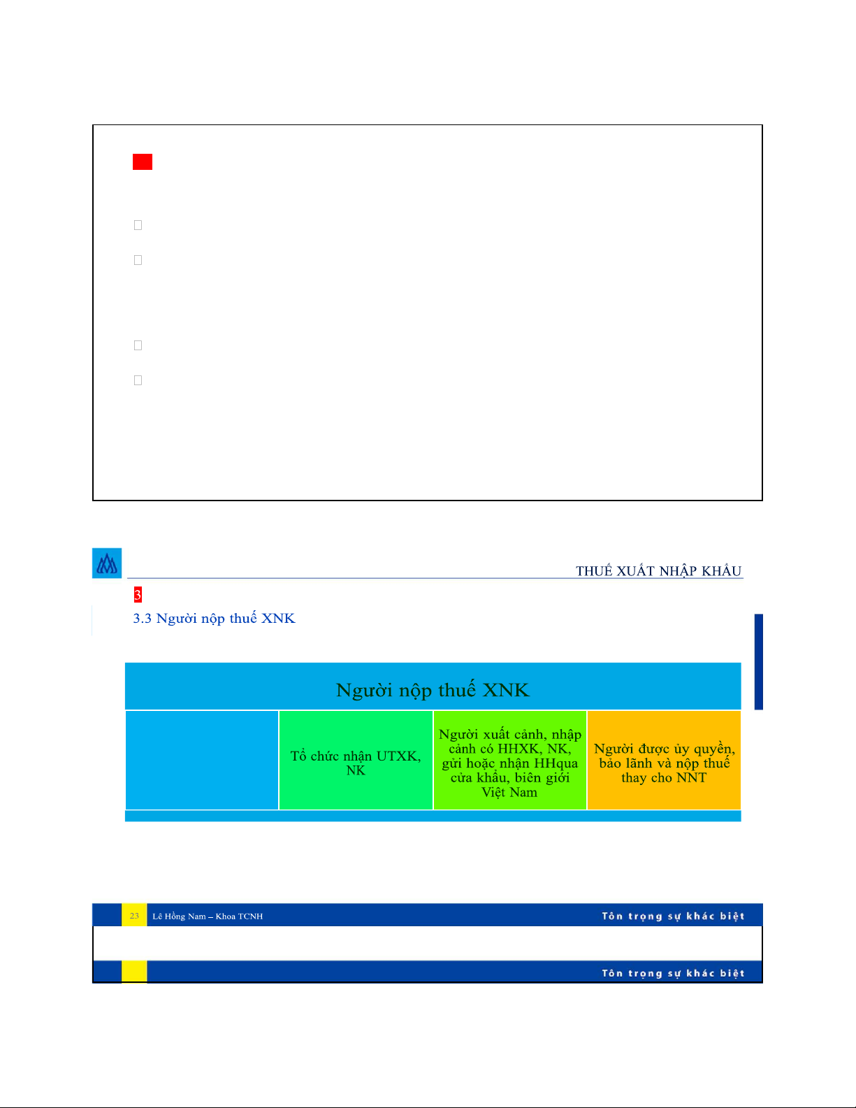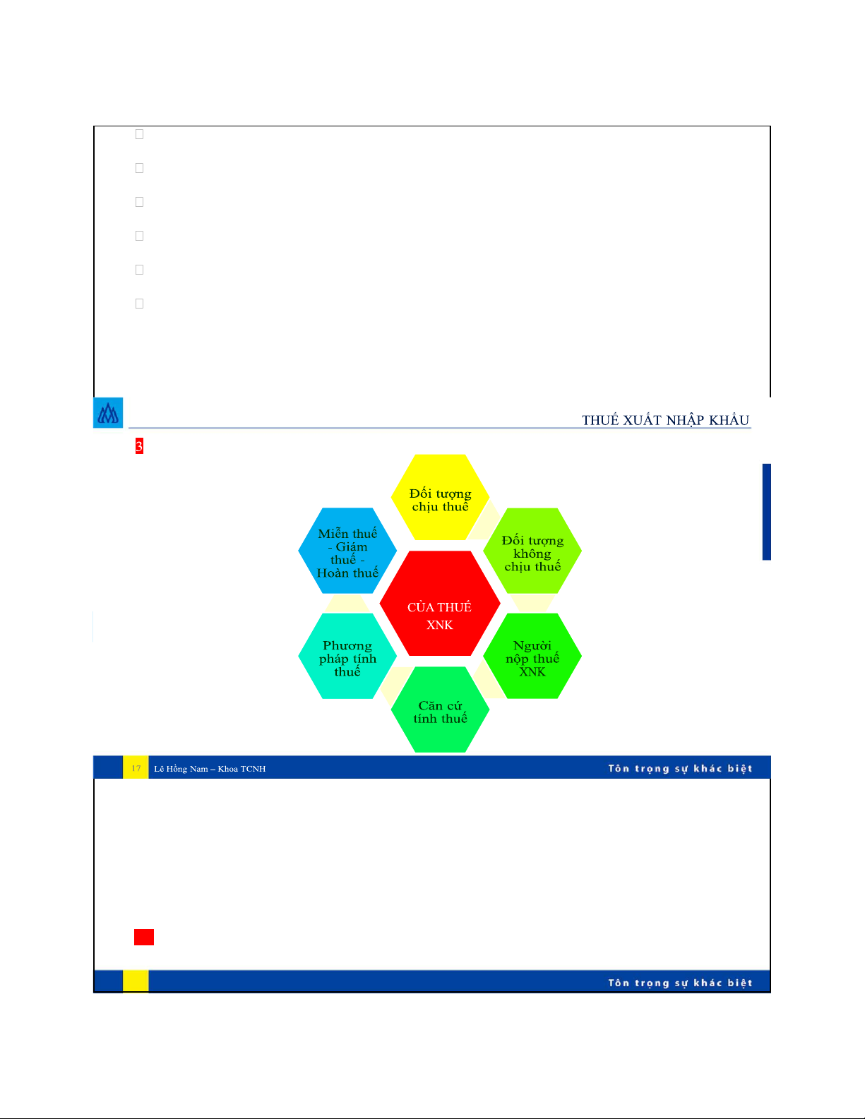 NỘI DUNG CỦA THUẾ XUẤT KHẨU, THUẾ NHẬP KHẨU              Chủ HHXK, NK                      Lê Hồng Nam – Khoa TCNH  12    lOMoAR cPSD| 47206071 24/04/2025    THUẾ XUẤT NHẬP KHẨU