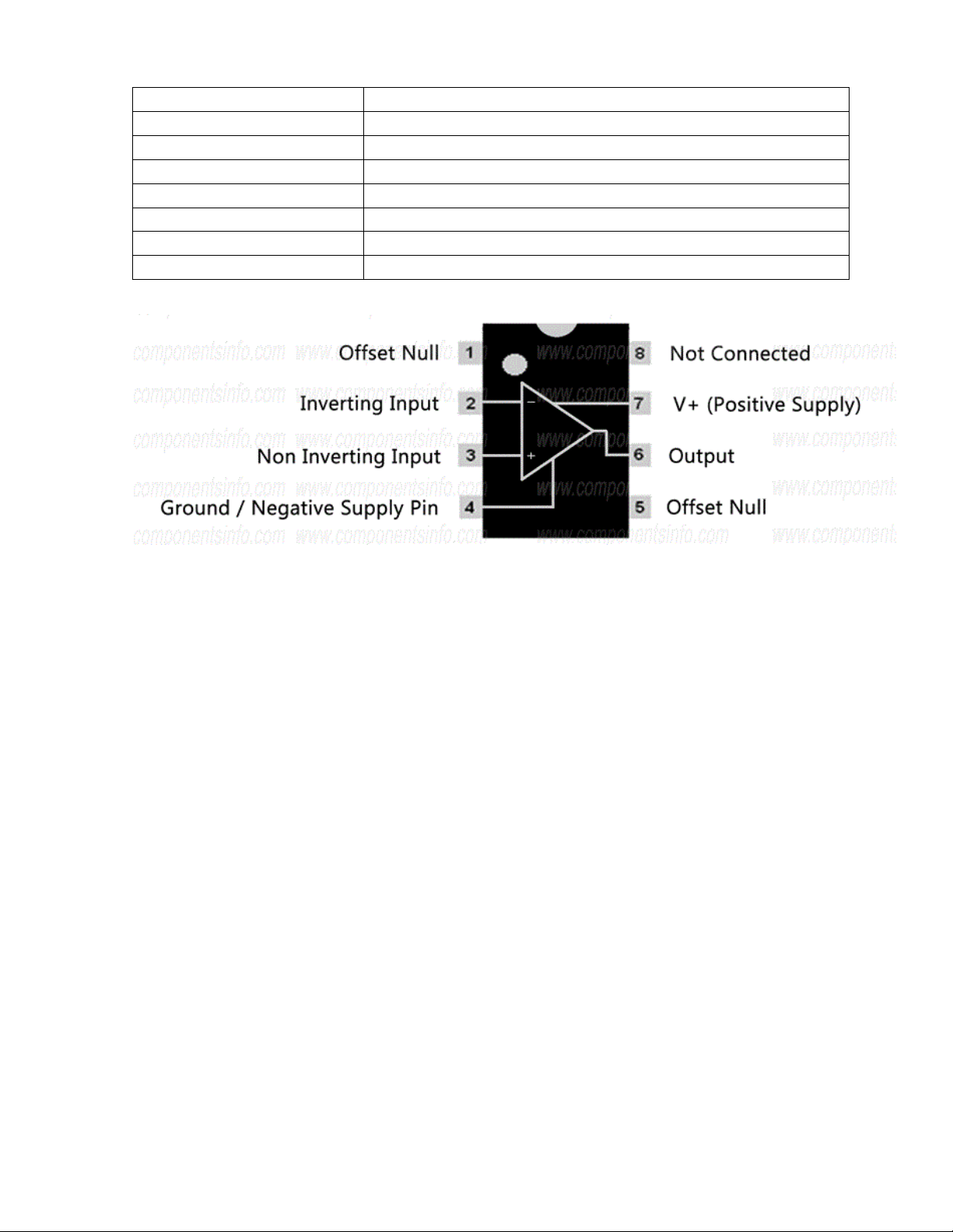 • Dòng hoạt động từ 1,7 đến 2,8mA. Sơ đồ chân Số chân Tên chân 1 Offset Null 2 Inverting Input 3 Non Inverting Input 4 V- 5 Offset Null 6 Output 7 V+ 8 NC