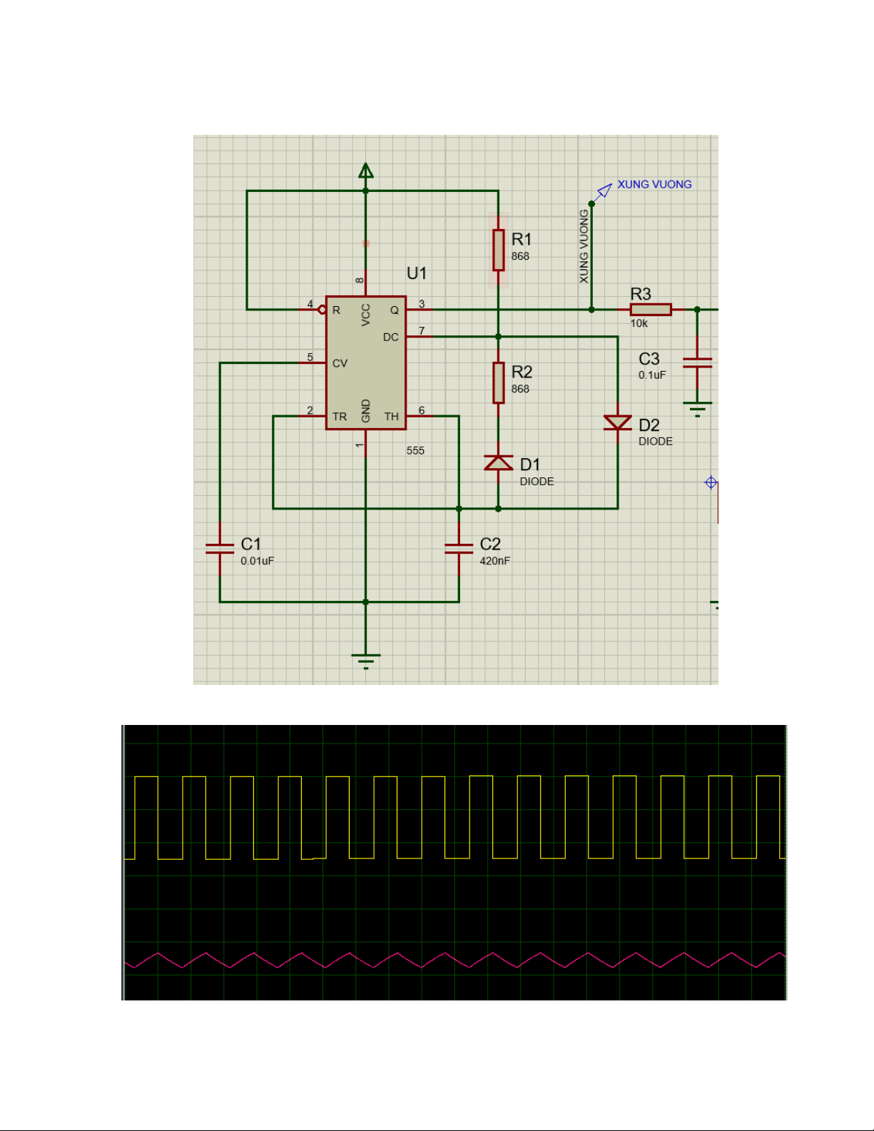 o Dùng IC555 tạo ra xung vuông có tần số 2kHz, Ton = Toff, Umax = 5V.