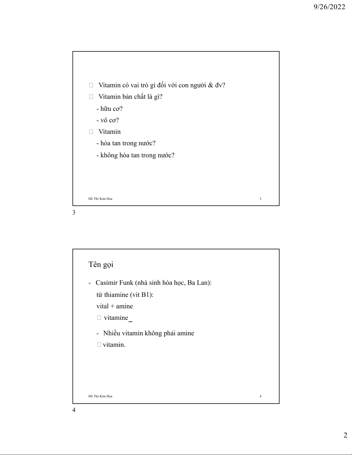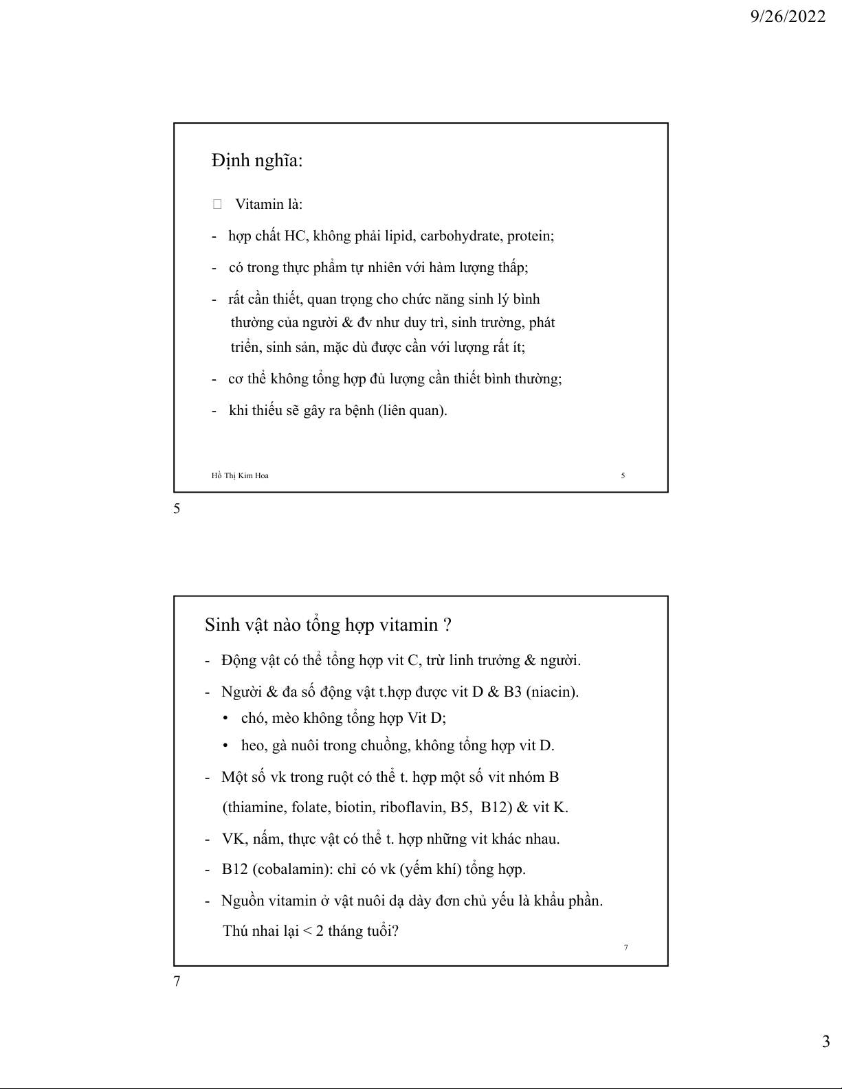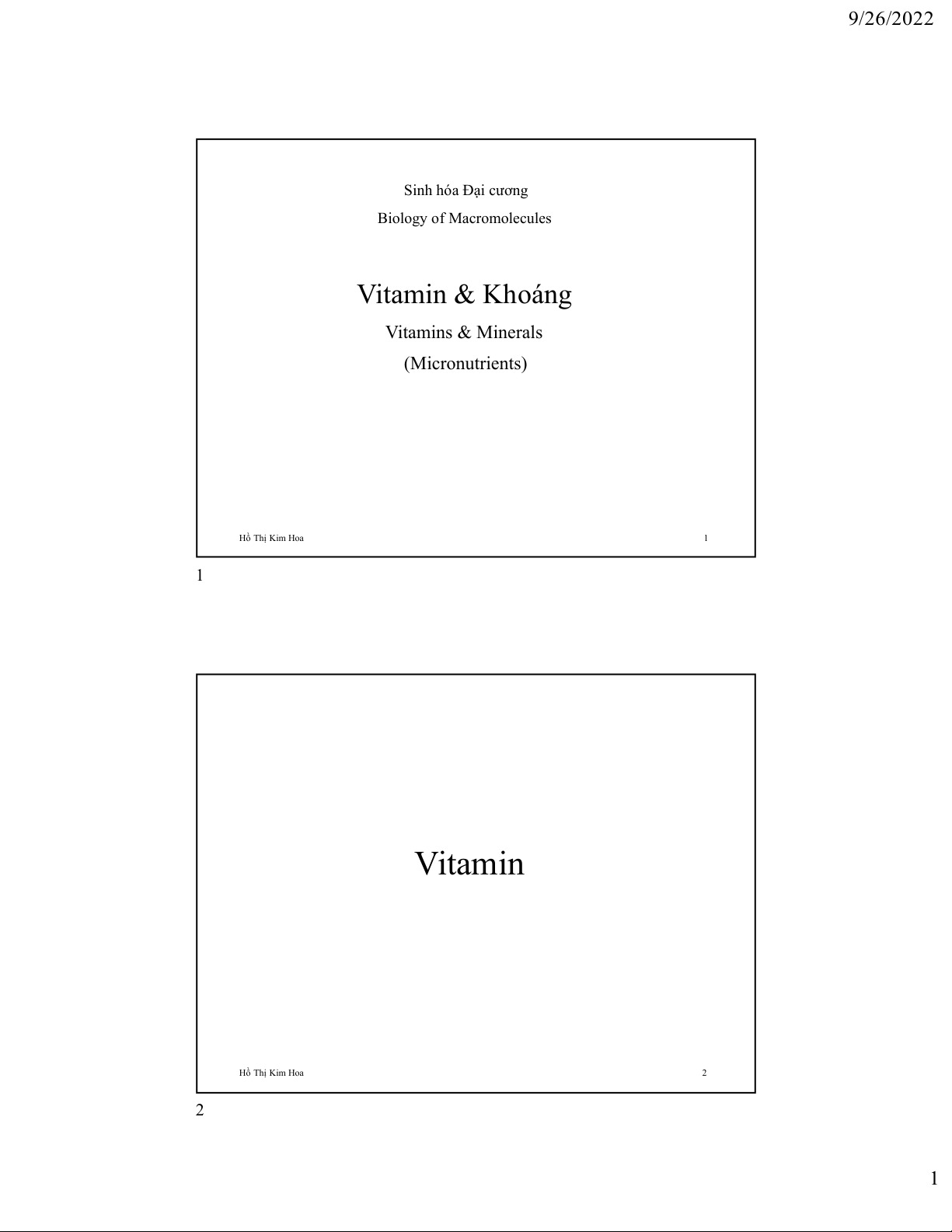 9/26/2022 Sinh hóa Đại cương Biology of Macromolecules Vitamin & Khoáng Vitamins & Minerals (Micronutrients) Hồ Thị Kim Hoa 1 1 Vitamin Hồ Thị Kim Hoa 2 2 1 9/26/2022