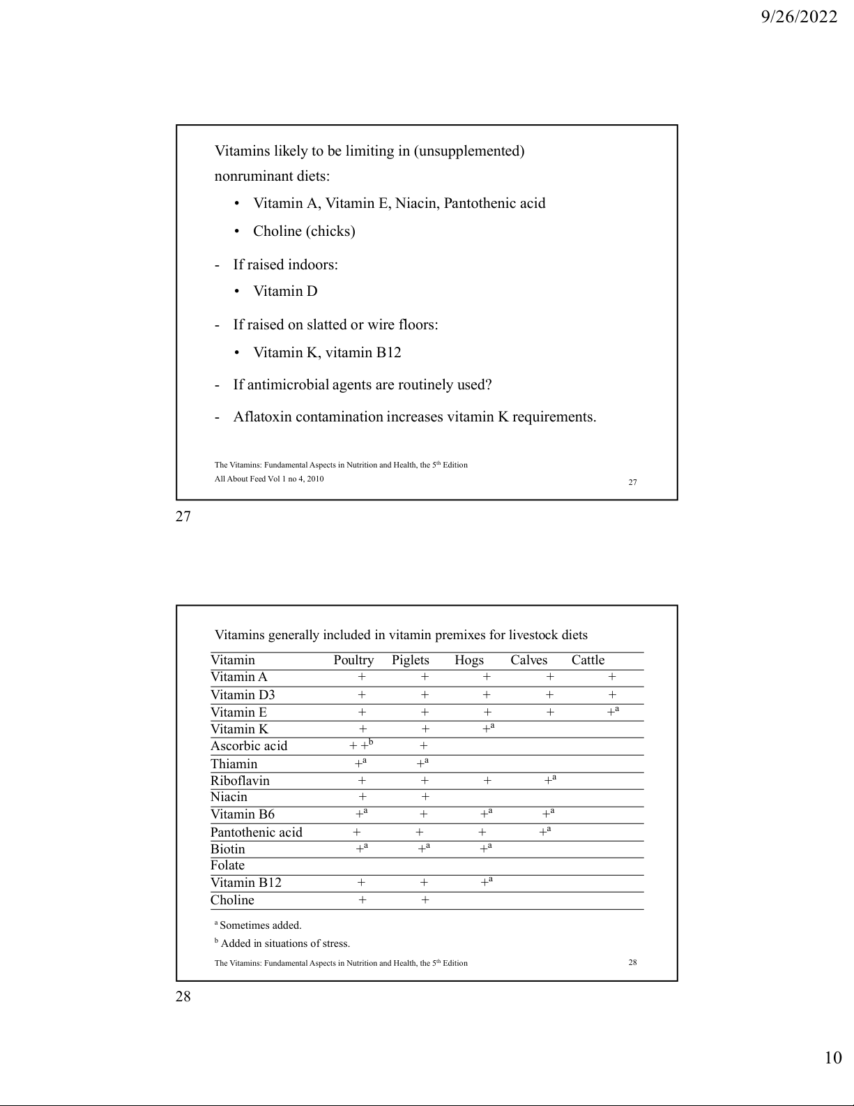 Vitamins generally included in vitamin premixes for livestock diets Vitamin Poultry Piglets Hogs Calves Cattle Vitamin A + + + + + Vitamin D3 + + + + + Vitamin E + + + + +a Vitamin K + + +a Ascorbic acid + +b + Thiamin +a +a Riboflavin + + + +a Niacin + + Vitamin B6 +a + +a +a Pantothenic acid + + + +a Biotin +a +a +a Folate Vitamin B12 + + +a Choline + + a Sometimes added.