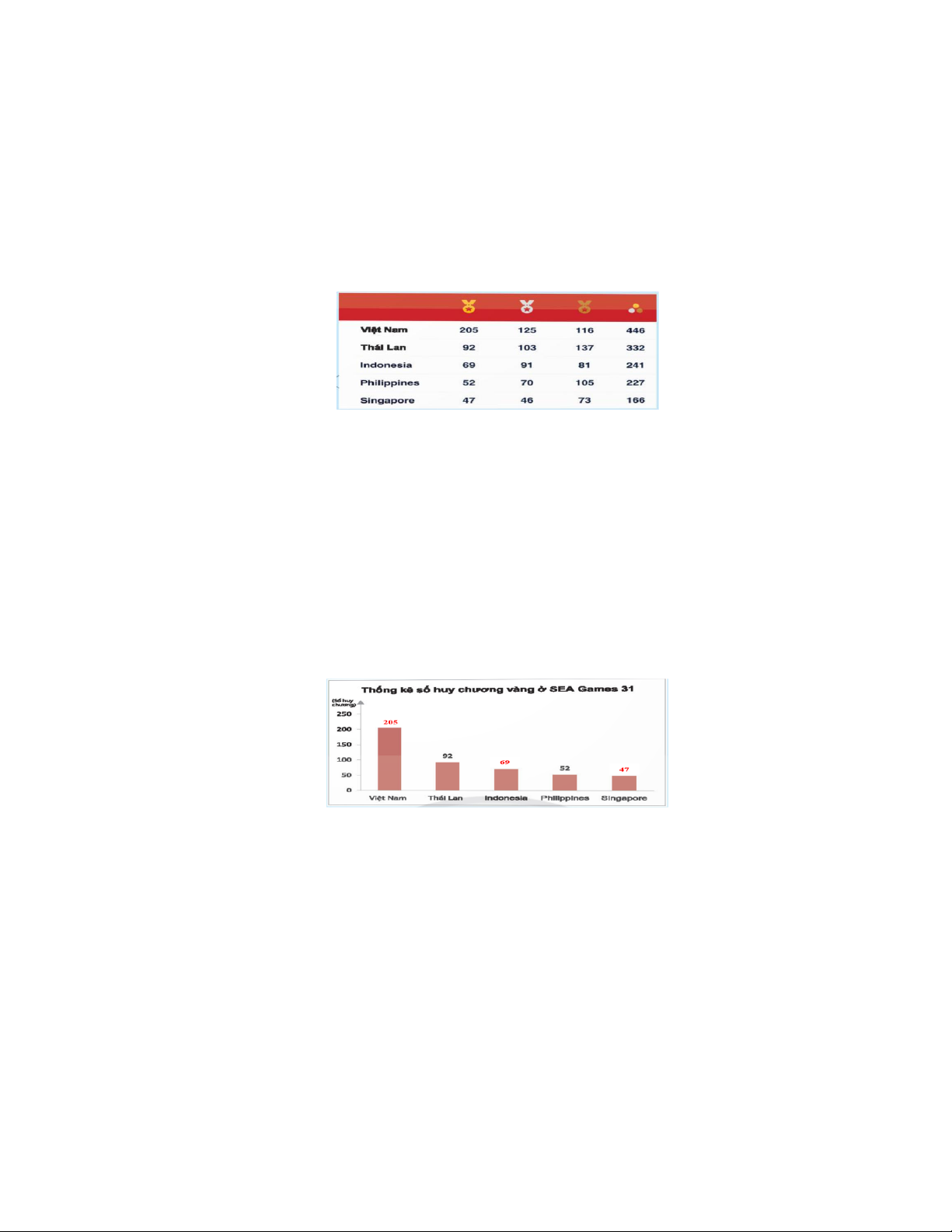 Quan sát bảng thống kê ta thấy số huy chương vàng của: + Việt Nam: 205; + Thái Lan: 92; + Indonesia: 69; + Philipppines: 52; + Singapore: 47.
