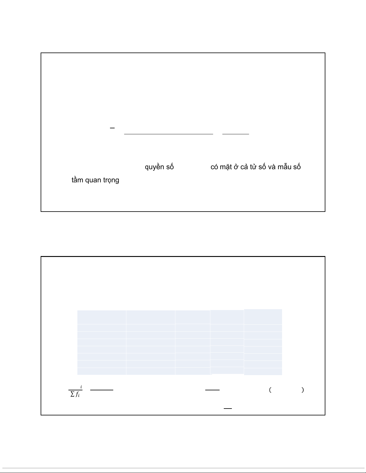Gọilàsốtrung bình cộng gia quyền. n xifi x f x f ... x f x n 1 1 2 2 n n i 1 1 f f2 ... fn fi i 1 filà tầnsố đ , óng vai trò là (đạilượng ) →