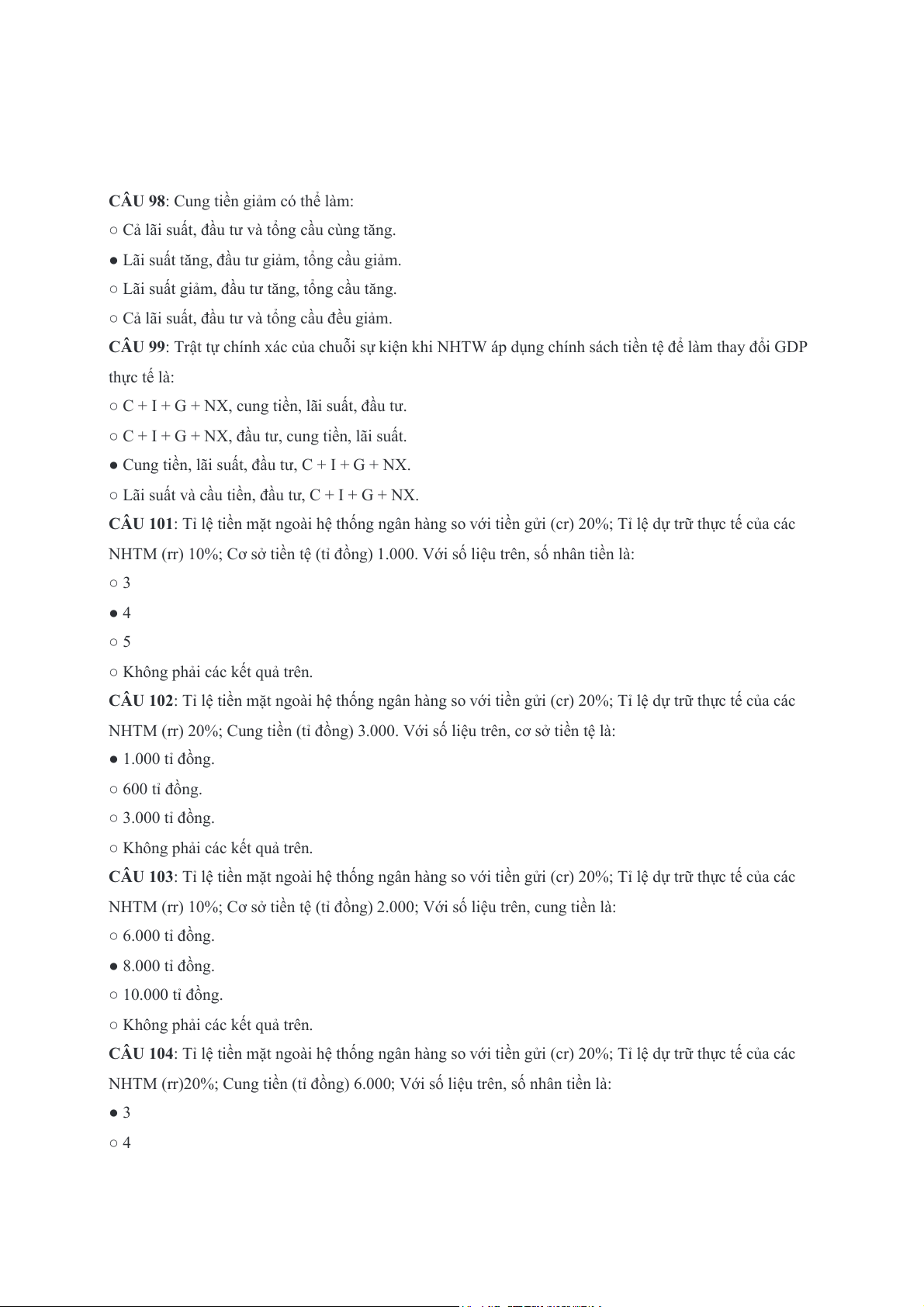 CÂU 103: Tỉ lệ tiền mặt ngoài hệ thống ngân hàng so với tiền gửi (cr) 20%; Tỉ lệ dự trữ thực tế của các