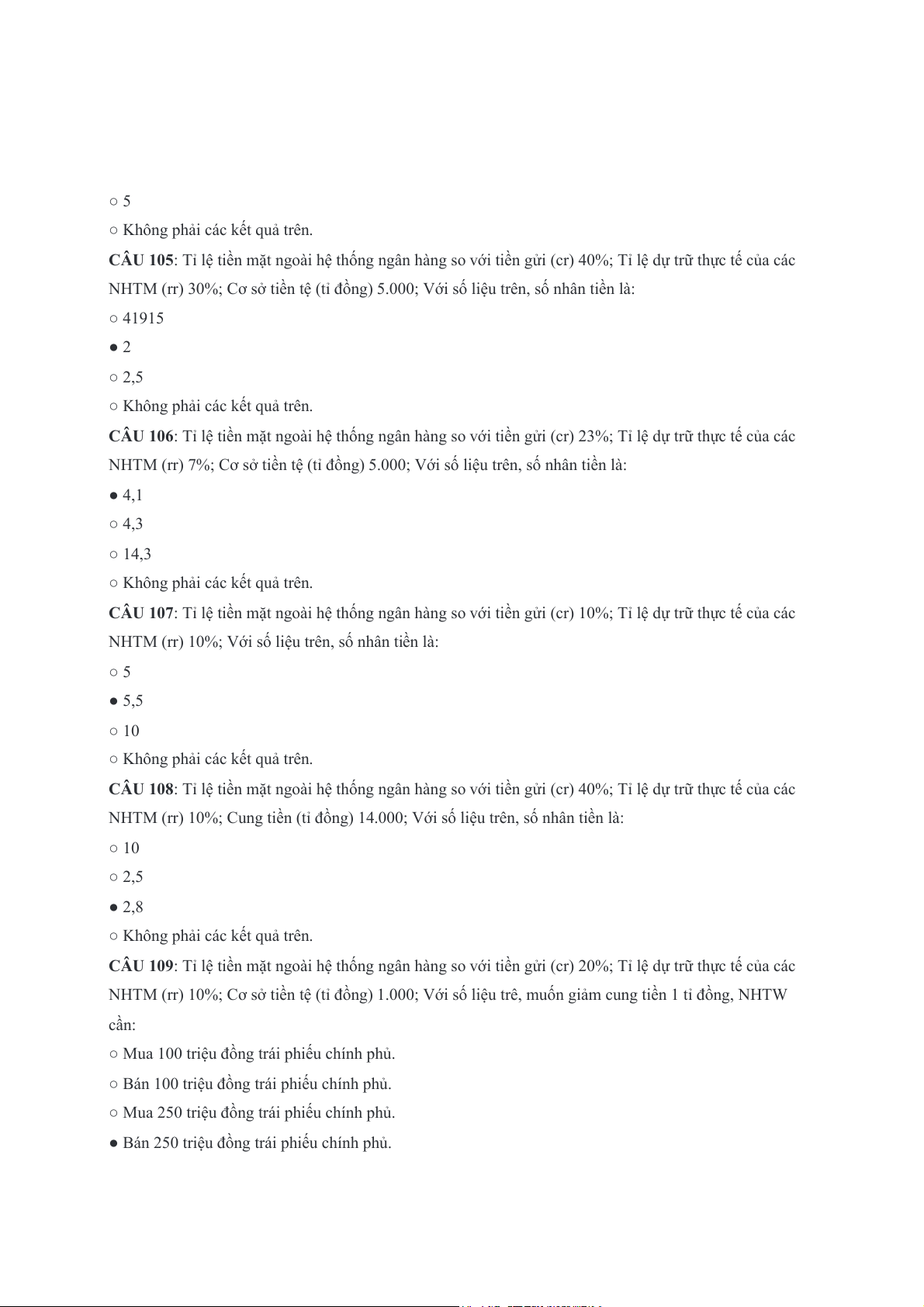 CÂU 109: Tỉ lệ tiền mặt ngoài hệ thống ngân hàng so với tiền gửi (cr) 20%; Tỉ lệ dự trữ thực tế của các