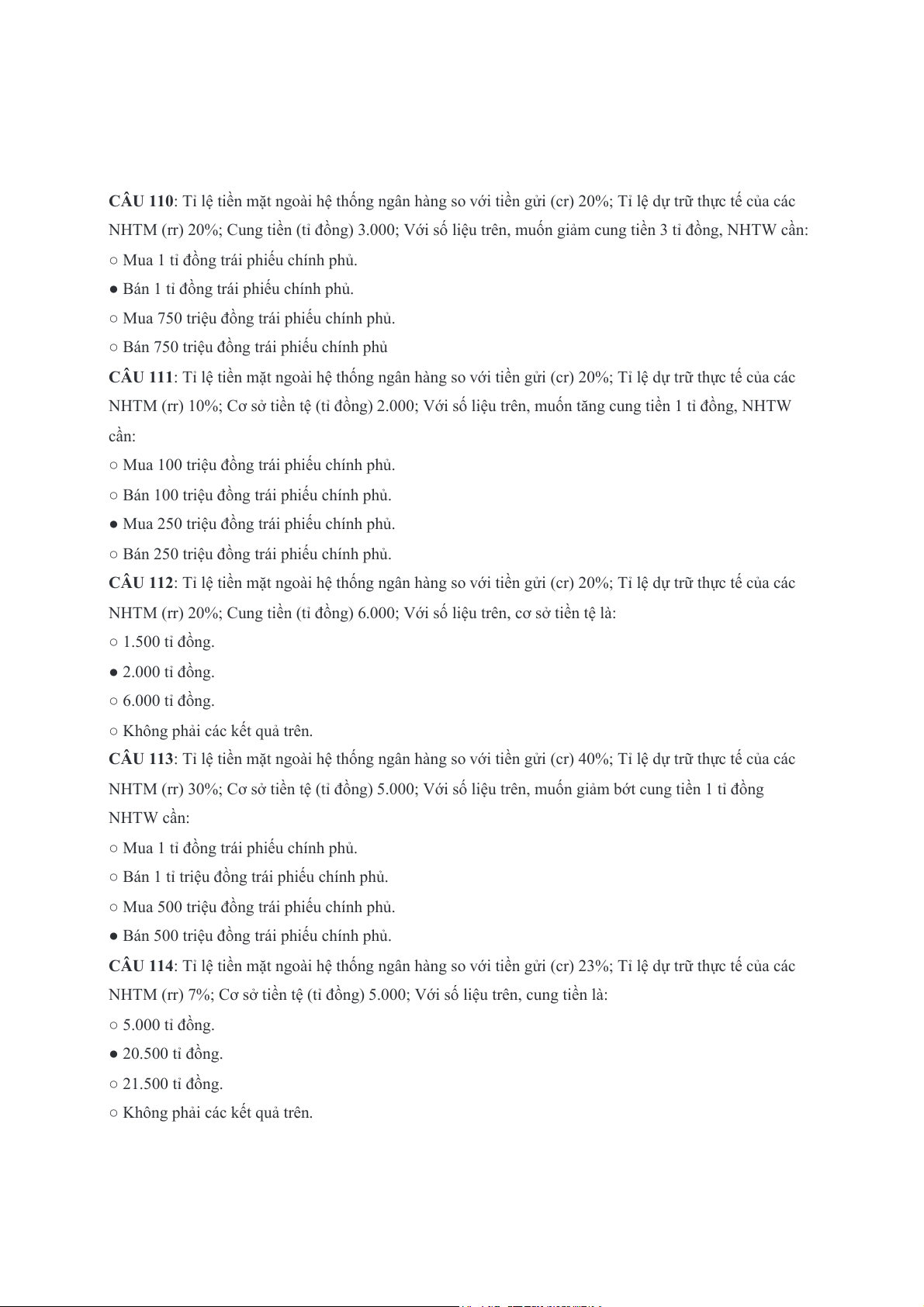CÂU 111: Tỉ lệ tiền mặt ngoài hệ thống ngân hàng so với tiền gửi (cr) 20%; Tỉ lệ dự trữ thực tế của các