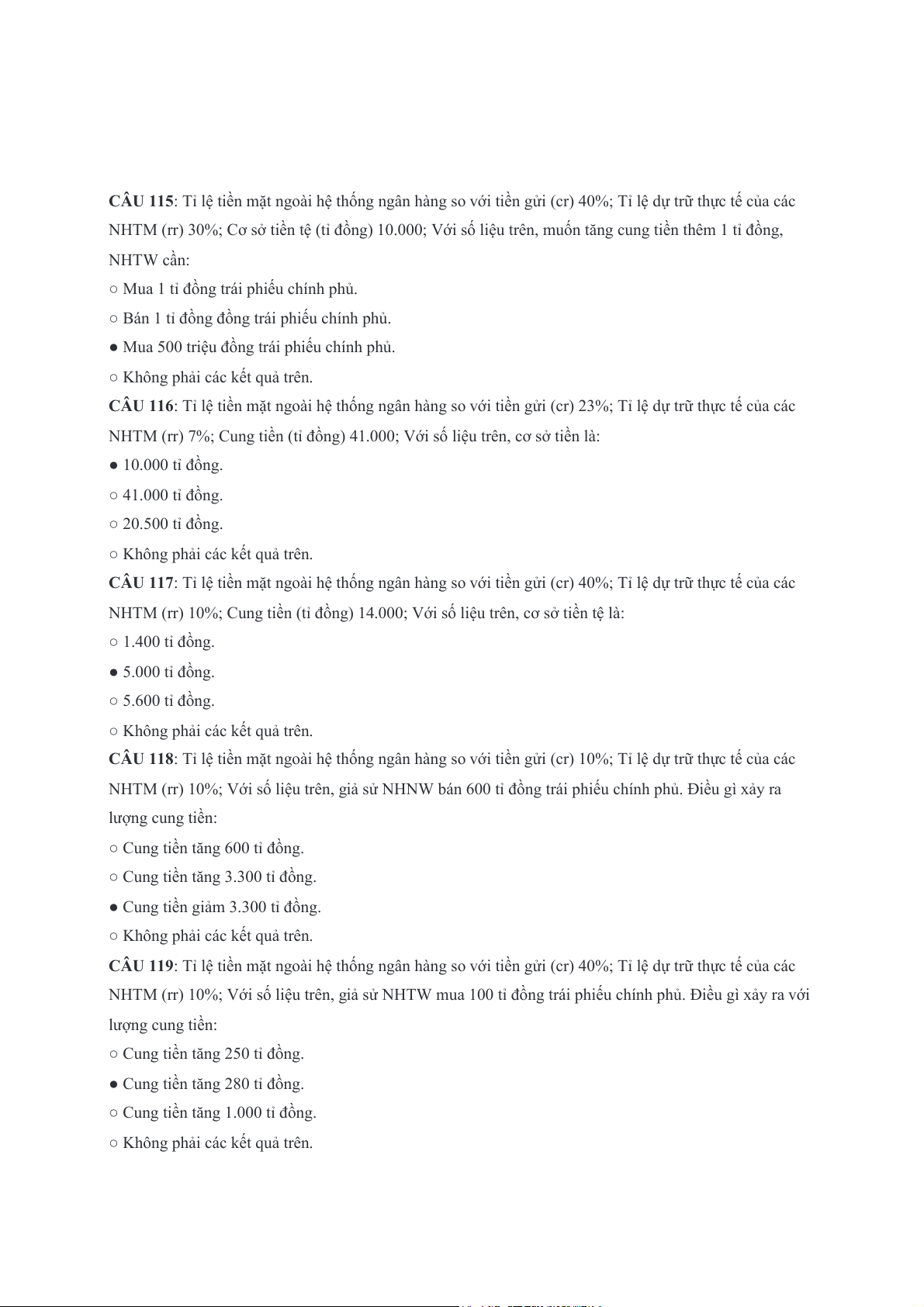 CÂU 115: Tỉ lệ tiền mặt ngoài hệ thống ngân hàng so với tiền gửi (cr) 40%; Tỉ lệ dự trữ thực tế của các