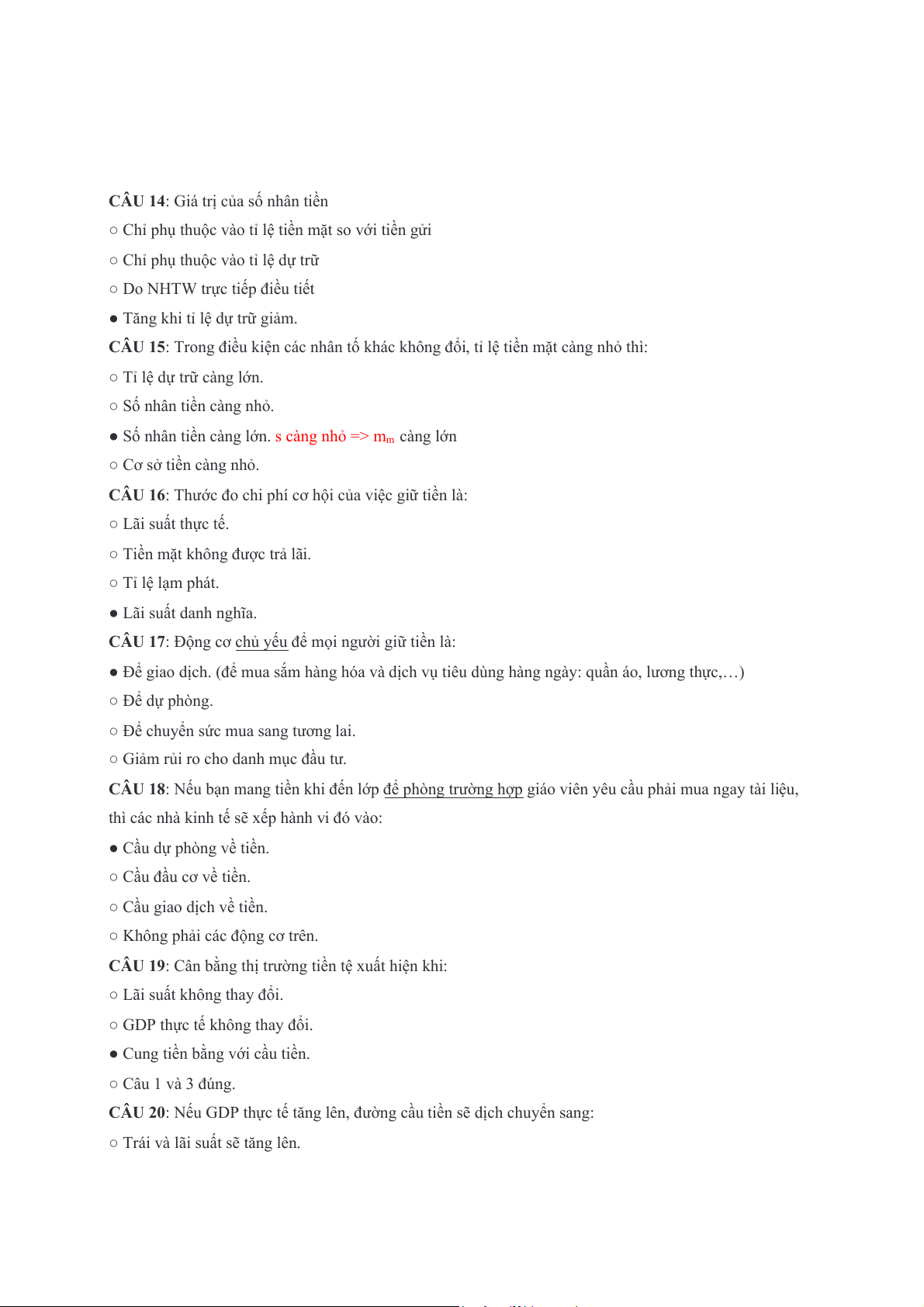 CÂU 15: Trong điều kiện các nhân tố khác không đổi, tỉ lệ tiền mặt càng nhỏ thì: