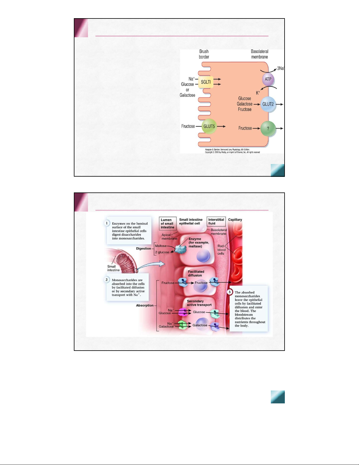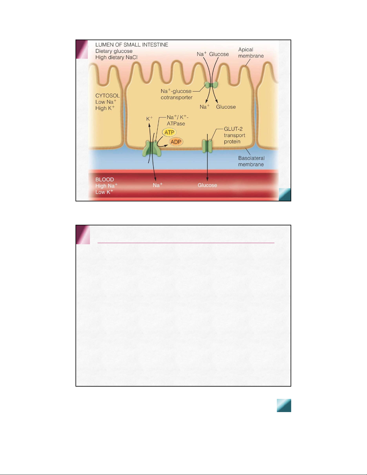 • Glucose và galactose được hấp thụ theo cơ chế vận chuyển tích cực phụ thuộc Na+ • Fructose được hấp