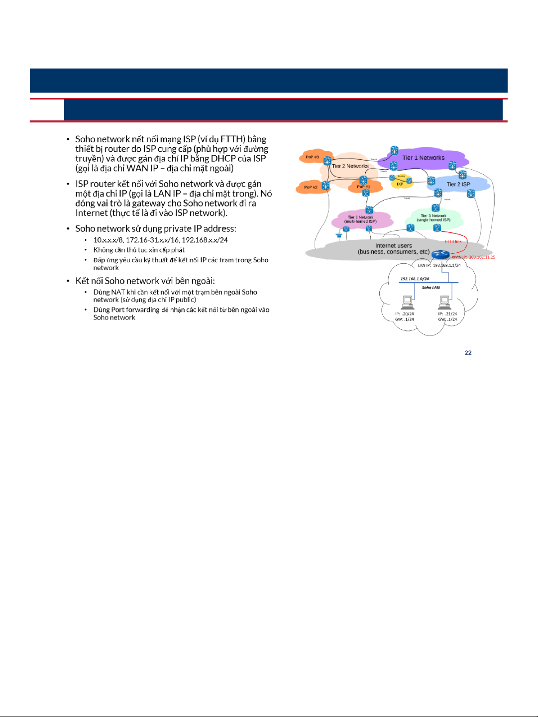 • Small Office & Home Office (Soho): kết nối Internet qua ISP và được cấp IP theo qui định của ISP này, thường là 01 địa chỉ IP không cố