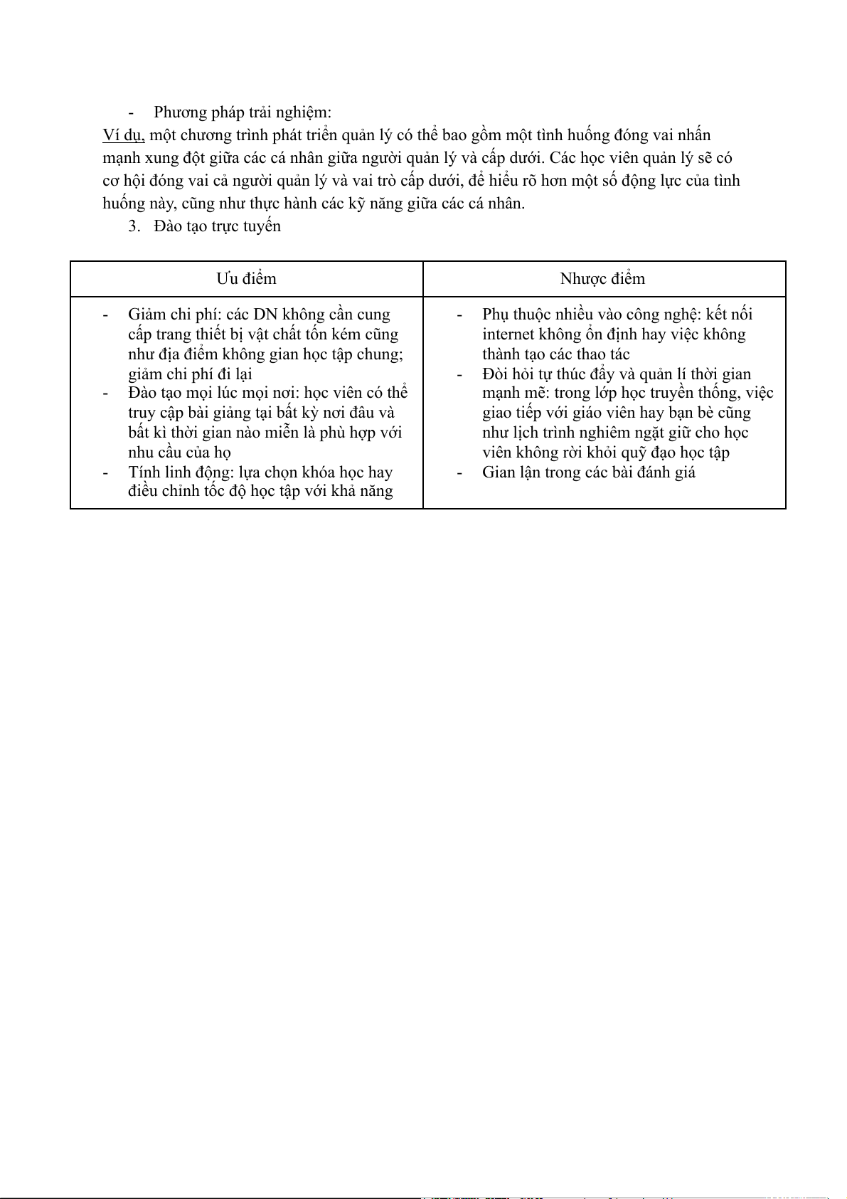 huống này, cũng như thực hành các kỹ năng giữa các cá nhân. 3. Đào tạo trực tuyến Ưu điểm Nhược điểm -