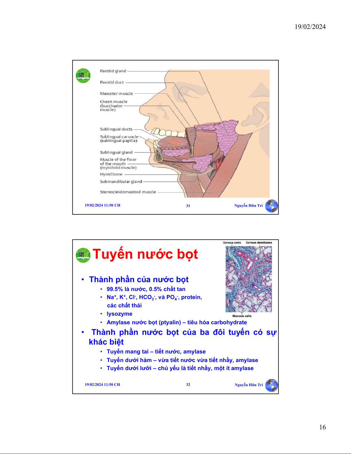 • Tuyến dưới lưỡi – chủ yếu là tiết nhầy, một ít amylase 19/02/2024 11:50 CH 32 Nguyễn Hữu Trí 16 19/02/2024 Tuyến nước bọt