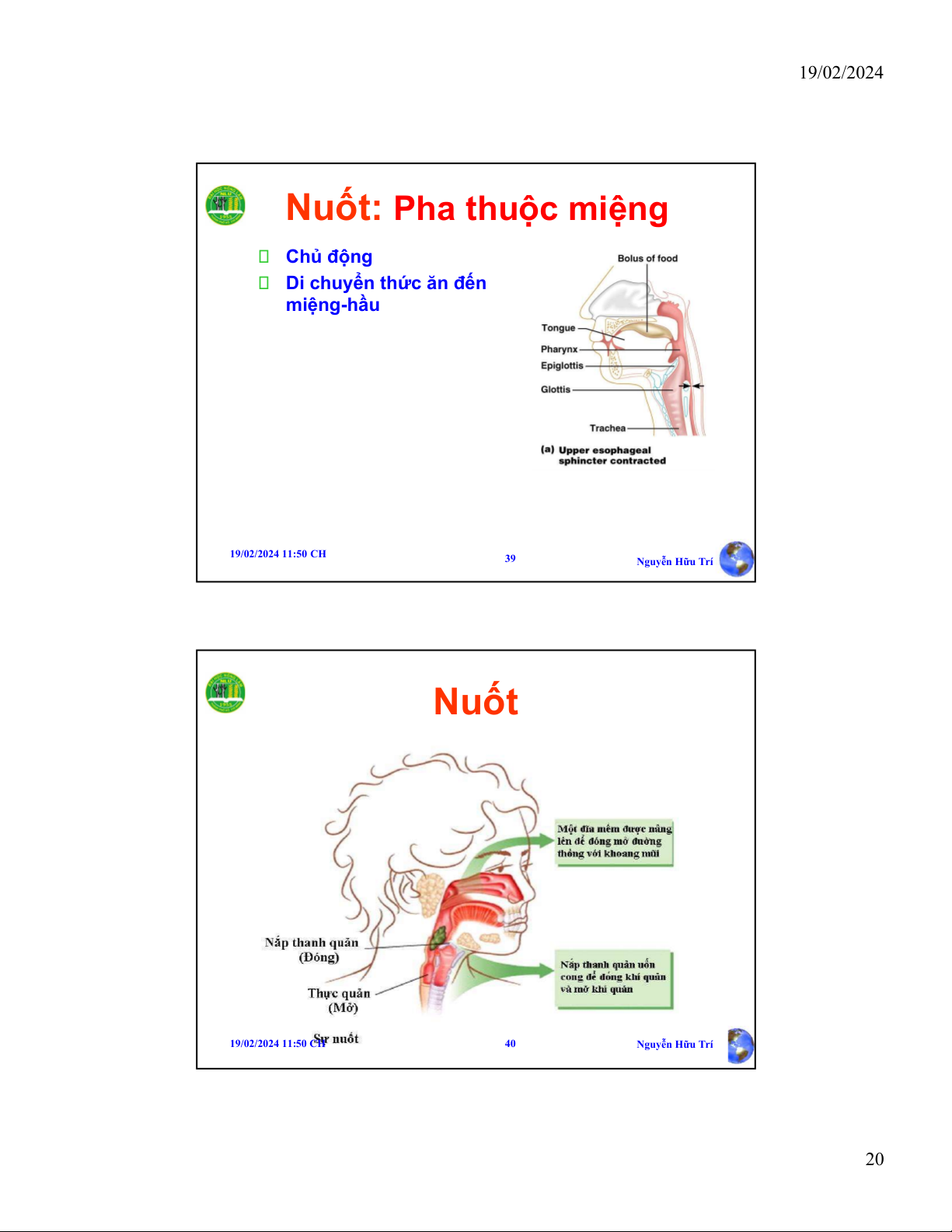 Di chuyển thức ăn đến miệng-hầu 19/02/2024 11:50 CH 39 Nguyễn Hữu Trí Nuốt 19/02/2024 11:50 CH 40 Nguyễn Hữu Trí 20
