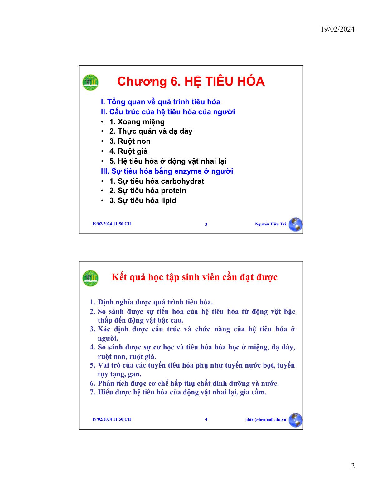 7. Hiểu được hệ tiêu hóa của động vật nhai lại, gia cầm. 19/02/2024 11:50 CH 4 nhtri@hcmuaf.edu.vn 2 19/02/2024