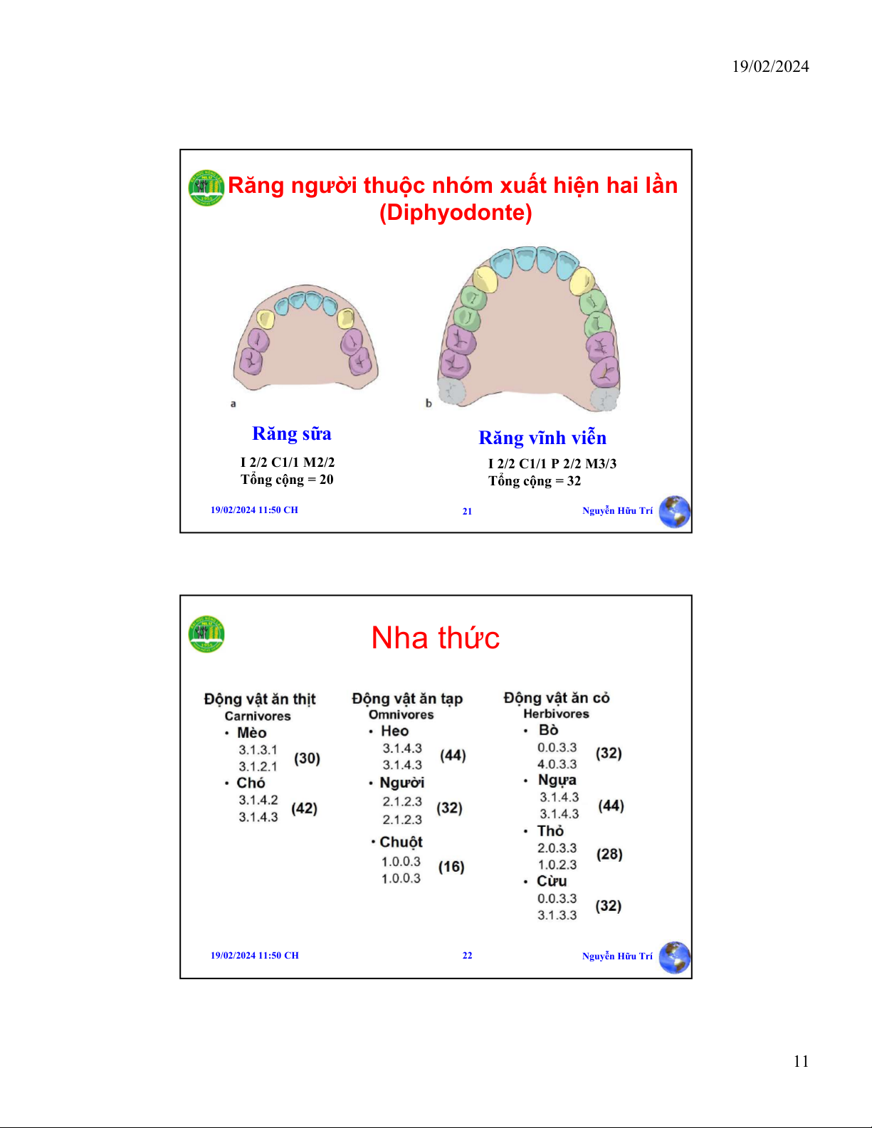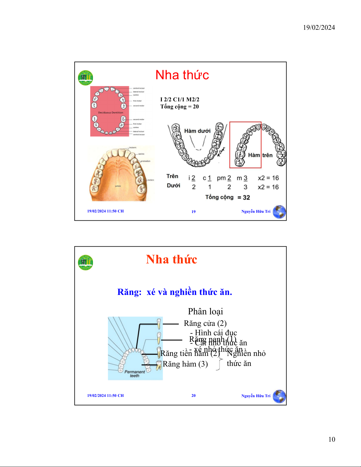 Sự thích nghi của răng 19/02/2024 11:50 CH 18 Nguyễn Hữu Trí 9 19/02/2024 Nha thức I 2/2 C1/1 M2/2 Tổng cộng = 20 19/02/2024 11:50 CH 19 Nguyễn Hữu Trí Nha thức