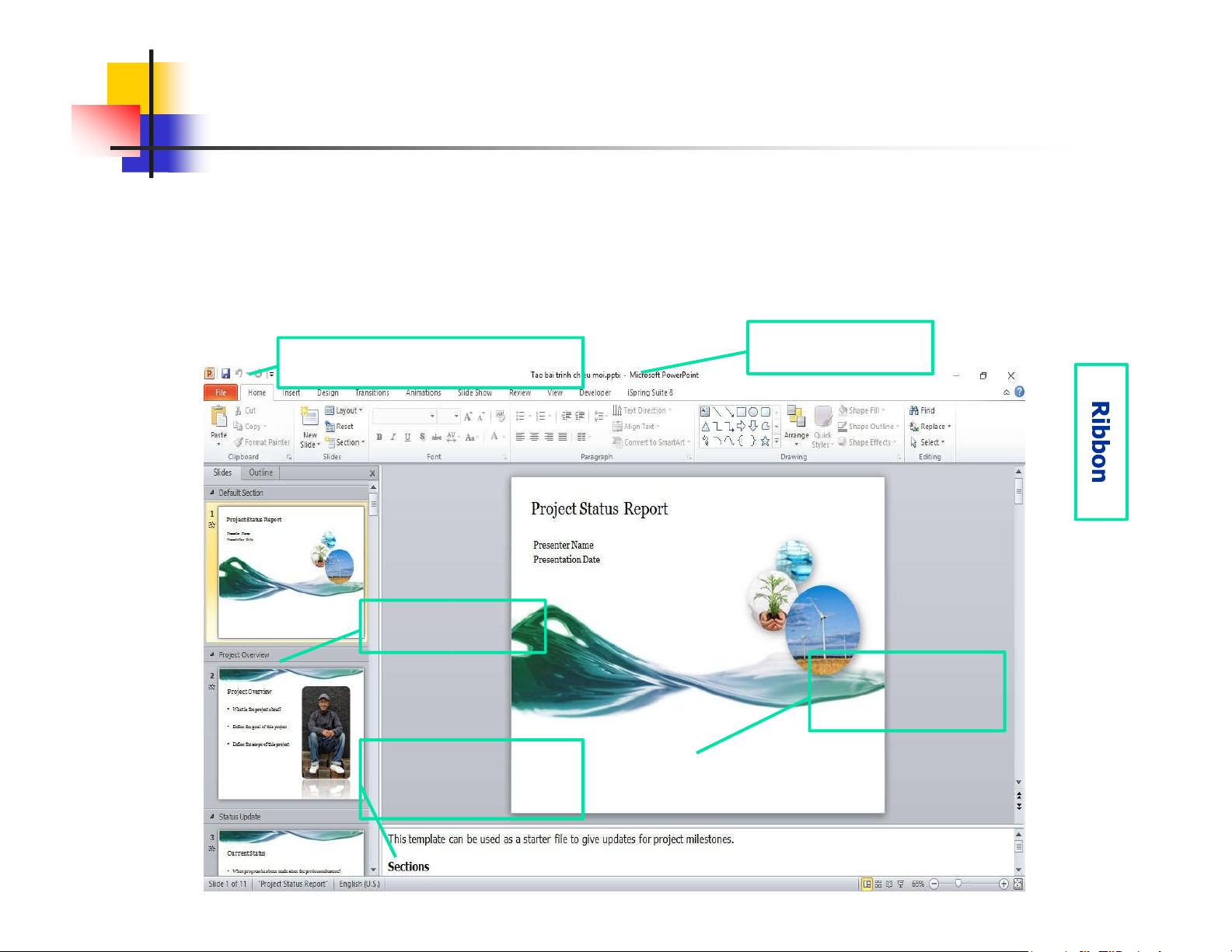 hiểu các thành phần trên cửa sổ chương trình Title bar Quick Access Toolbar Thẻ Slides Vùng soạn