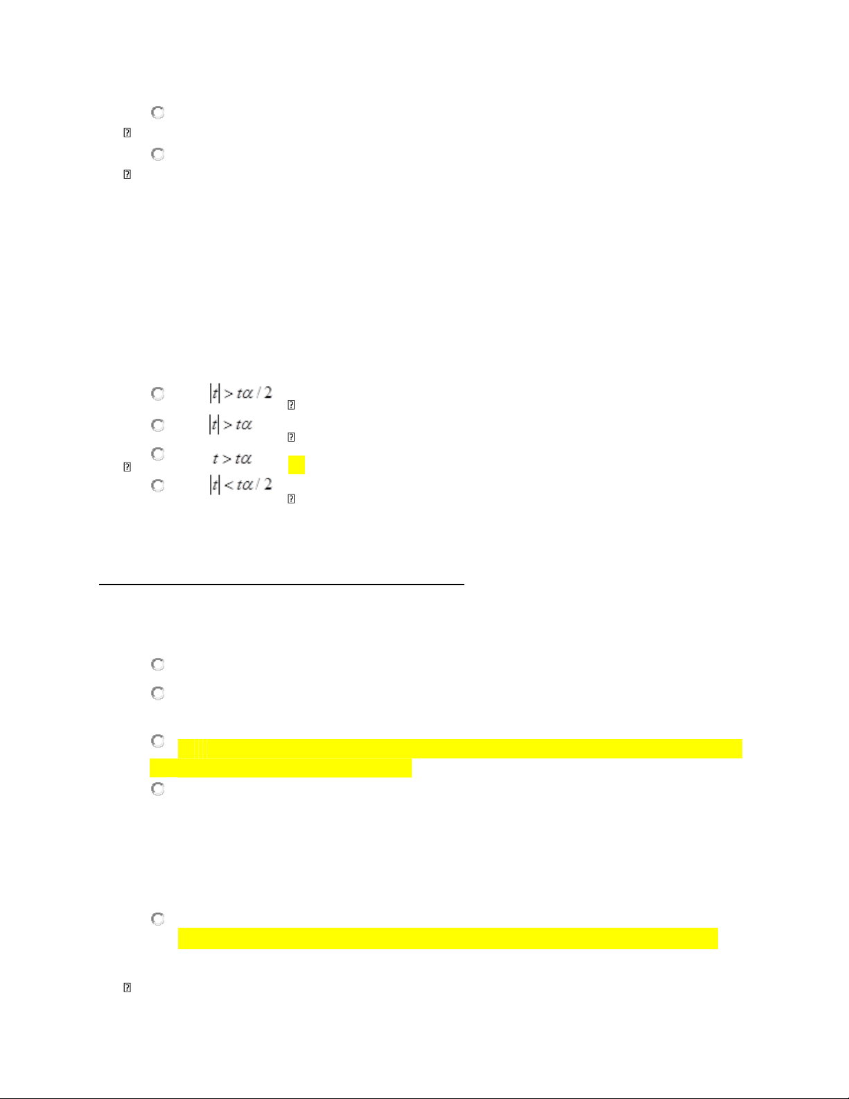 Khi thực hiện kiểm định hệ số hồi qui của phương trình hồi qui tuyến tính đơn, miền bác bỏ là: Chọn một câu trả lời • A) B) C) D)