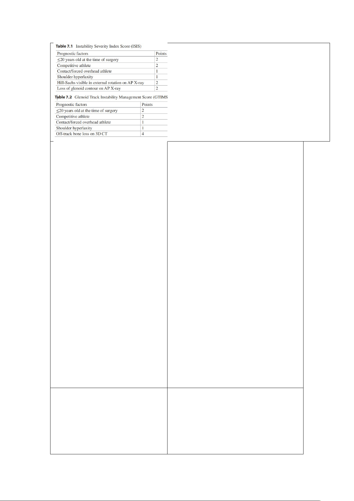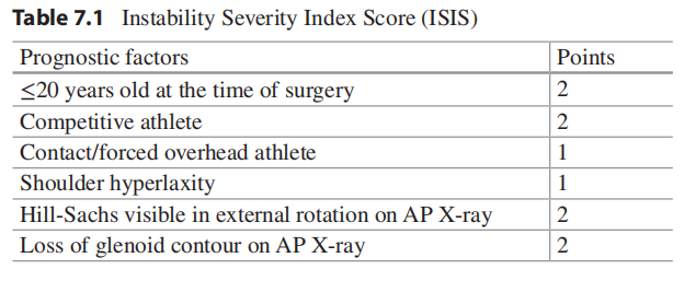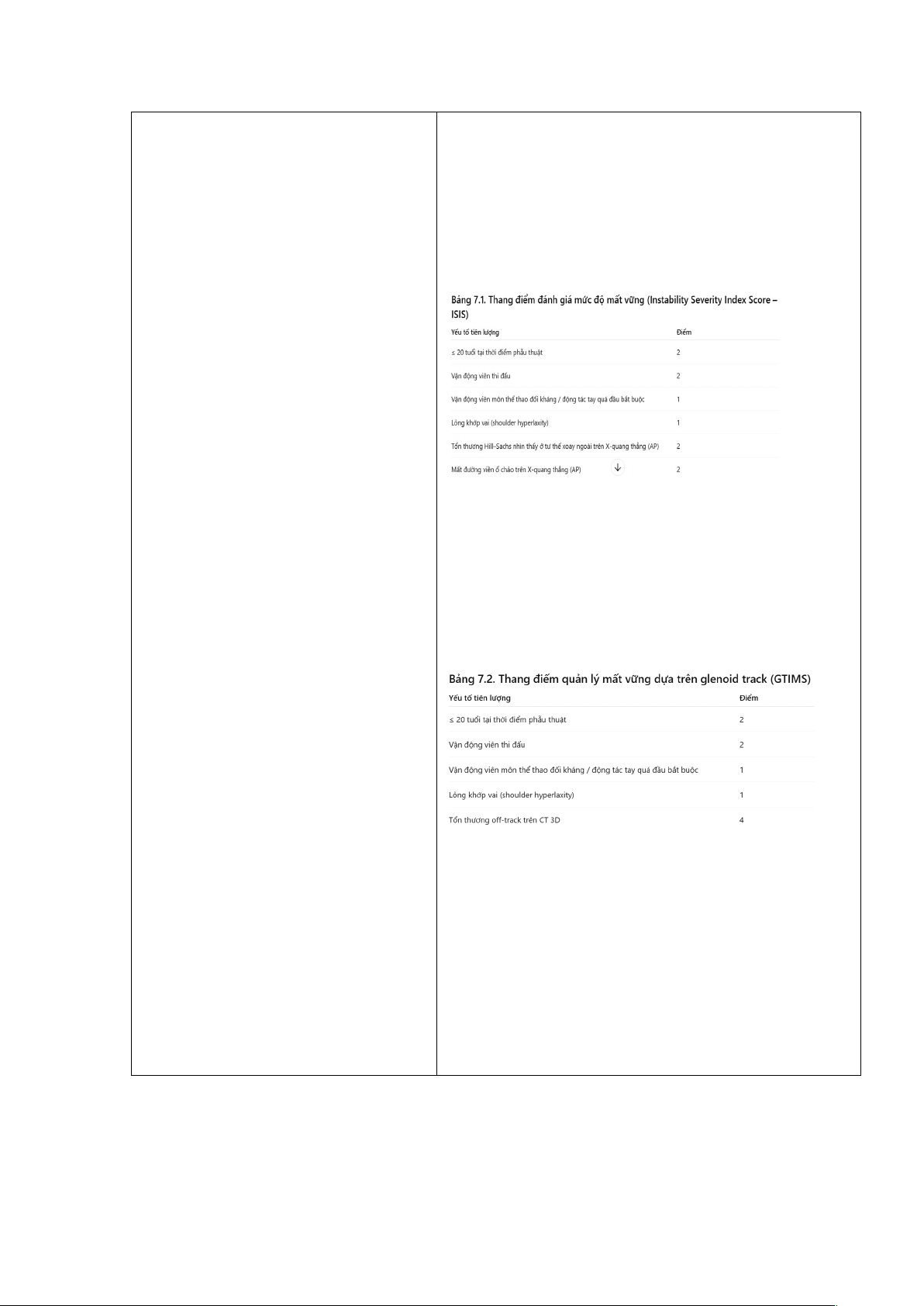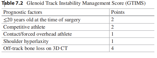 Gần đây hơn, thang điểm Glenoid Track Instability Management Score (GTIMS) đã được giới thiệu [22]. So với ISIS, GTIMS dựa vào CT scan 3D, thay vì X-quang thường, để đánh giá mức độ mất xương ổ chảo và chỏm cánh tay (Bảng 7.2).