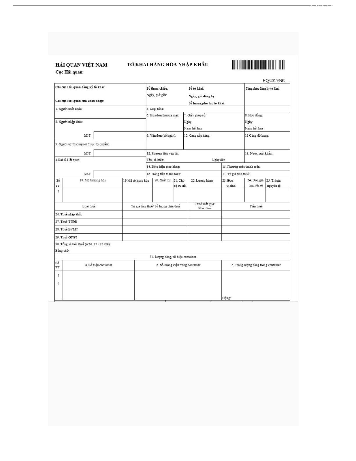 Nếu thực hiện tờ khai giấy thì dựa vào mẫu HQ/2015/NK: 2 bản chính