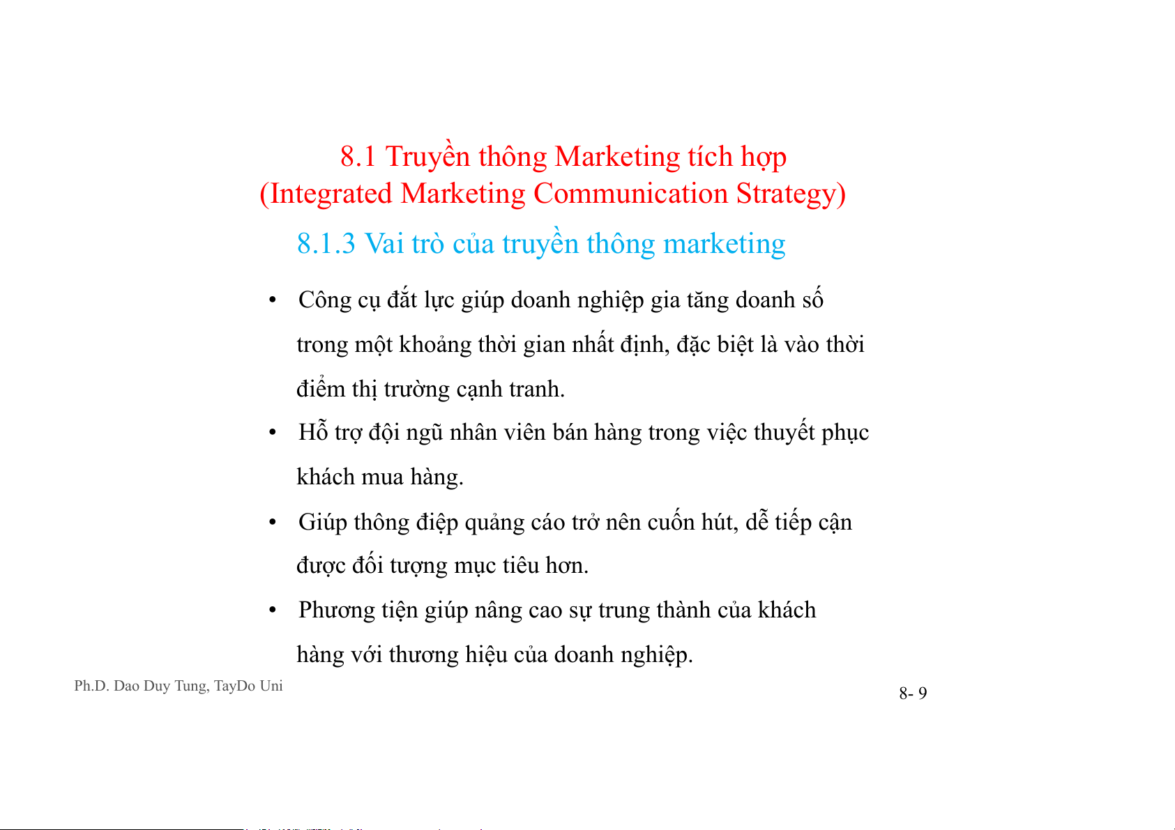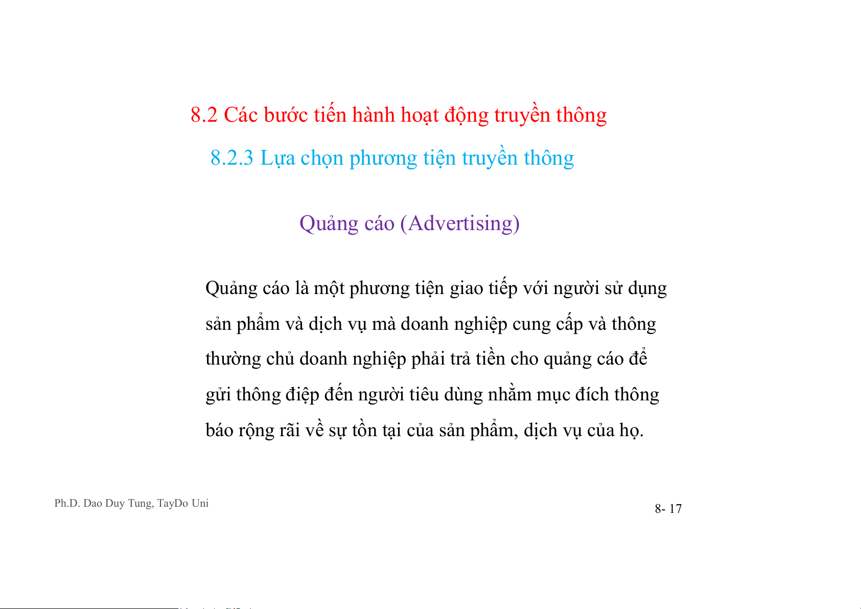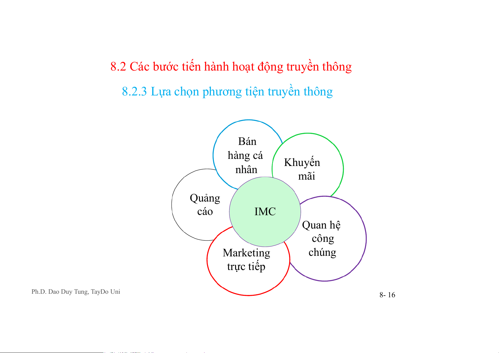 8.2.3 Lựa chọn phương tiện truyền thông Bán hàng cá Khuyến nhân mãi Quảng cáo IMC Quan hệ công Marketing chúng trực tiếp Ph.D. Dao Duy Tung, TayDo Uni 8- 16