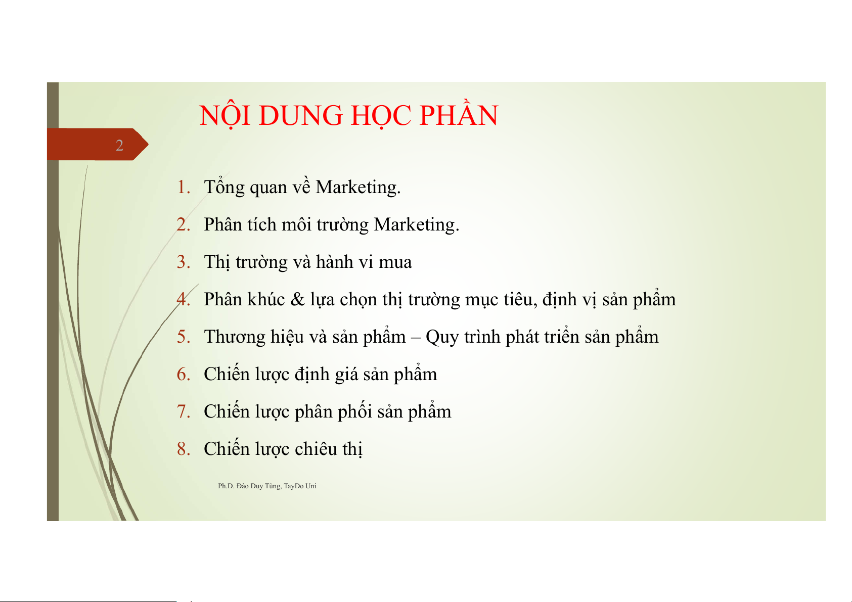 Đại học Tây Đô, Cần Thơ 2021 NỘI DUNG HỌC PHẦN 2 1. Tổng quan về Marketing.