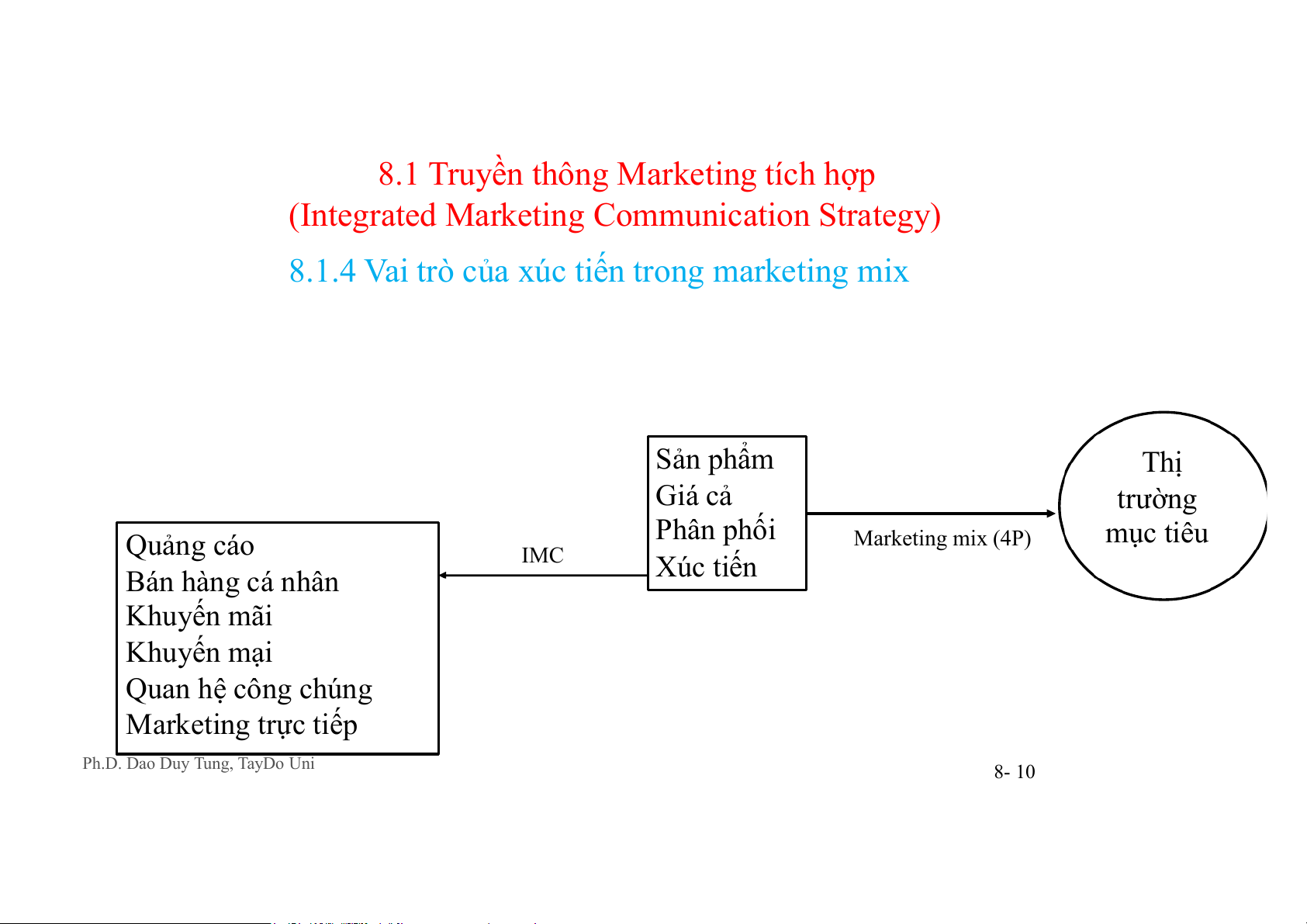 8.1.4 Vai trò của xúc tiến trong marketing mix Sản phẩm Thị Giá cả trường Phân phối Marketing mix (4P) mục tiêu Quảng cáo IMC Bán hàng cá nhân Xúc tiến Khuyến mãi Khuyến mại Quan hệ công chúng Marketing trực tiếp Ph.D. Dao Duy Tung, TayDo Uni 8- 10