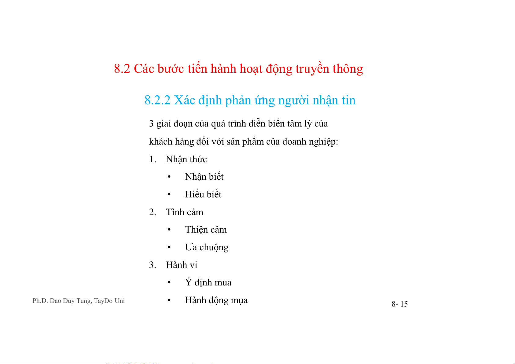 khách hàng đối với sản phẩm của doanh nghiệp: 1. Nhận thức • Nhận biết • Hiểu biết 2. Tình cảm • Thiện cảm • Ưa chuộng 3. Hành vi • Ý định mua Ph.D. Dao Duy Tung, TayDo Uni • Hành động mụa 8- 15