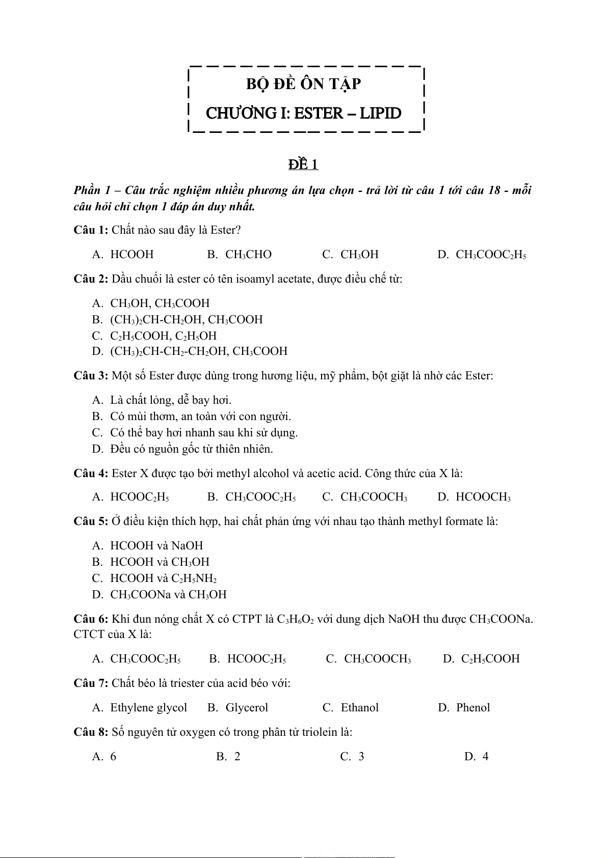 Câu 1: Chất nào sau đây là Ester? A. HCOOH B. CH3CHO C. CH OH 3 D. CH3COOC2H5