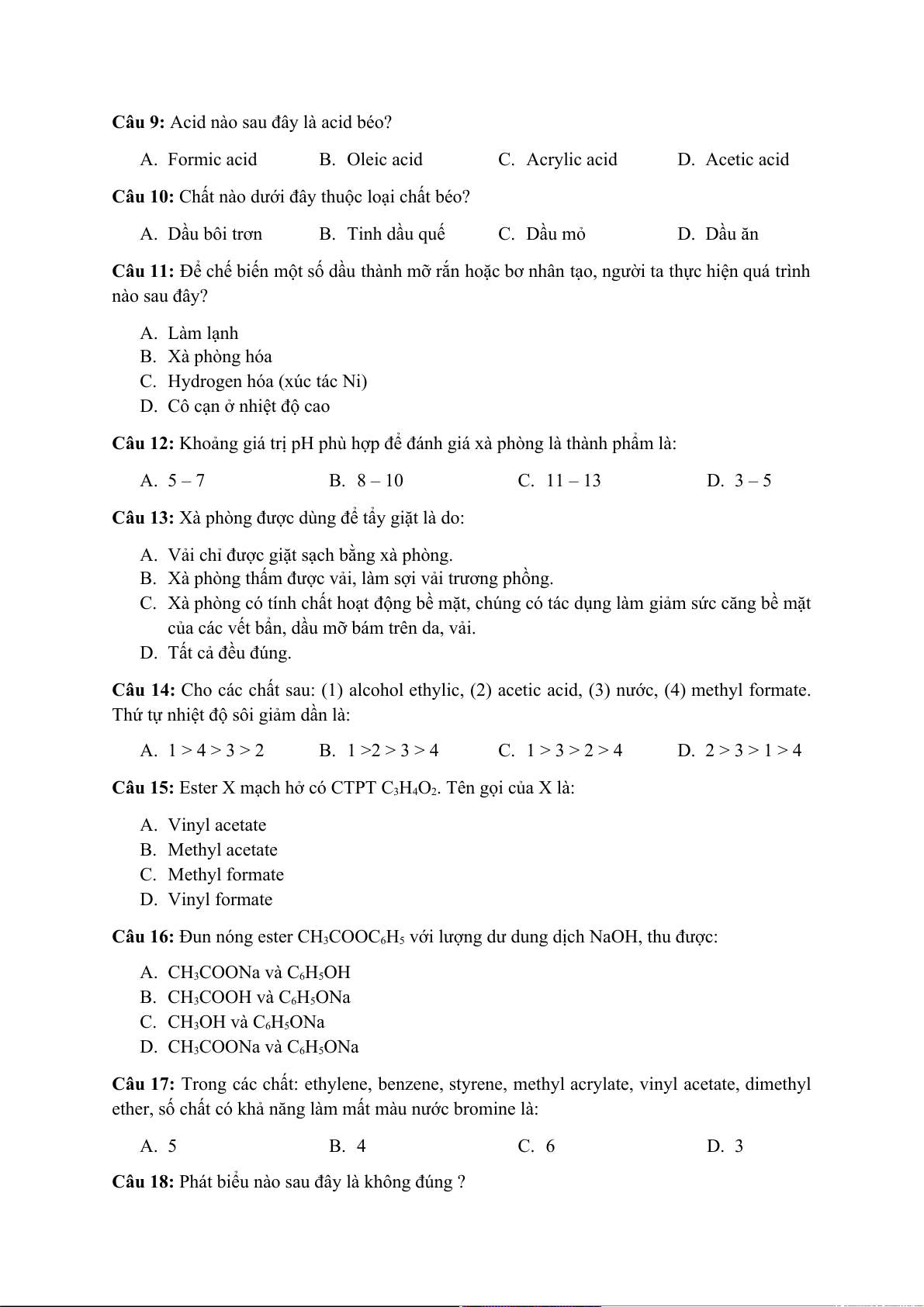 Câu 9: Acid nào sau đây là acid béo? A. Formic acid B. Oleic acid C. Acrylic acid D. Acetic acid