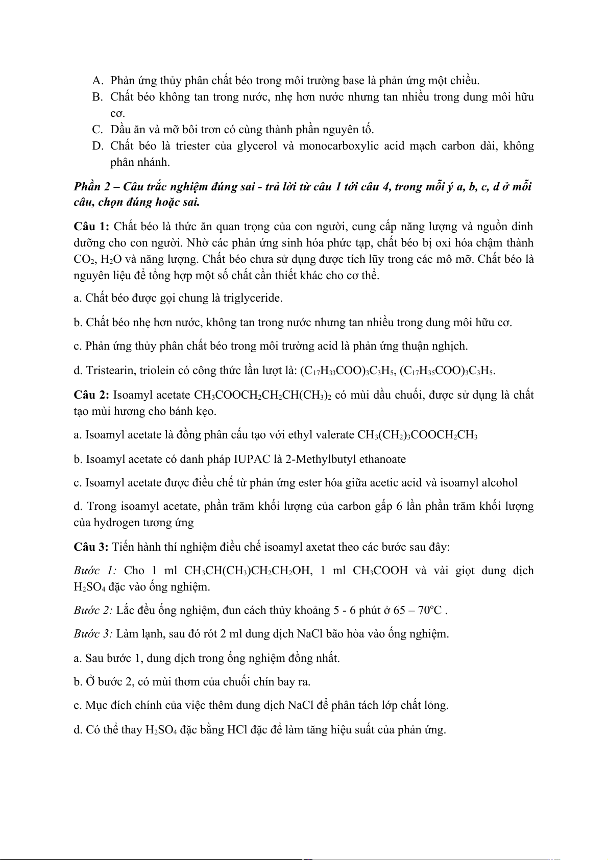 d. Tristearin, triolein có công thức lần lượt là: (C17H33 3 COO) C3H5 17 , (C H35 3 COO) C3H5.