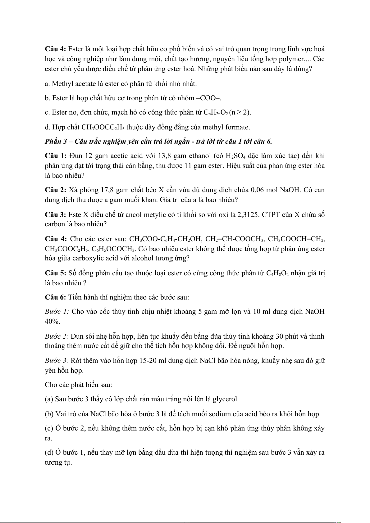 Câu 4: Ester là một loại hợp chất hữu cơ phổ biến và có vai trò quan trọng trong lĩnh vực hoá