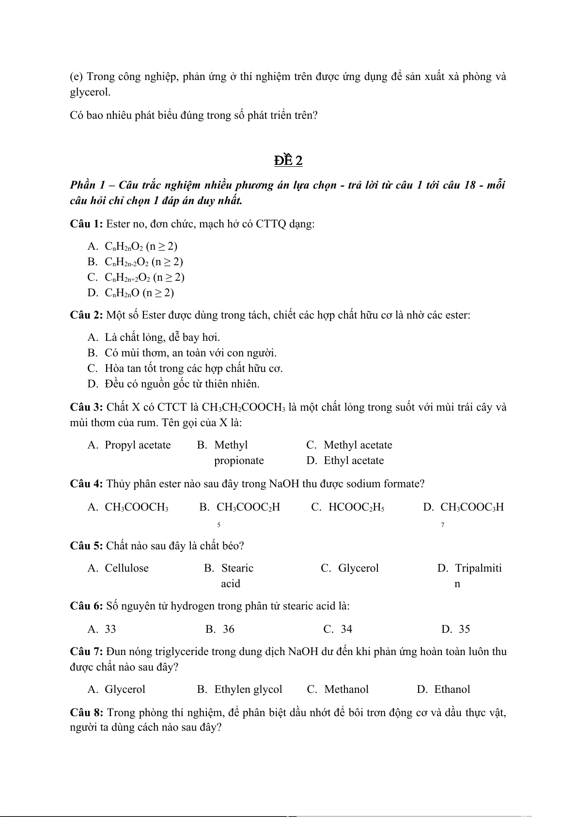 Câu 5: Chất nào sau đây là chất béo? A. Cellulose B. Stearic C. Glycerol D. Tripalmiti acid n