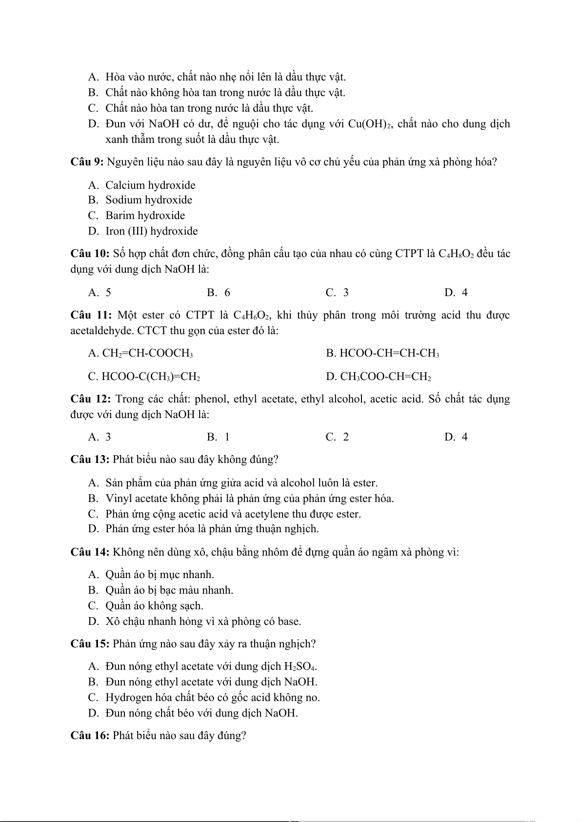 Câu 9: Nguyên liệu nào sau đây là nguyên liệu vô cơ chủ yếu của phản ứng xà phòng hóa? A. Calcium hydroxide B. Sodium hydroxide C. Barim hydroxide D. Iron (III) hydroxide
