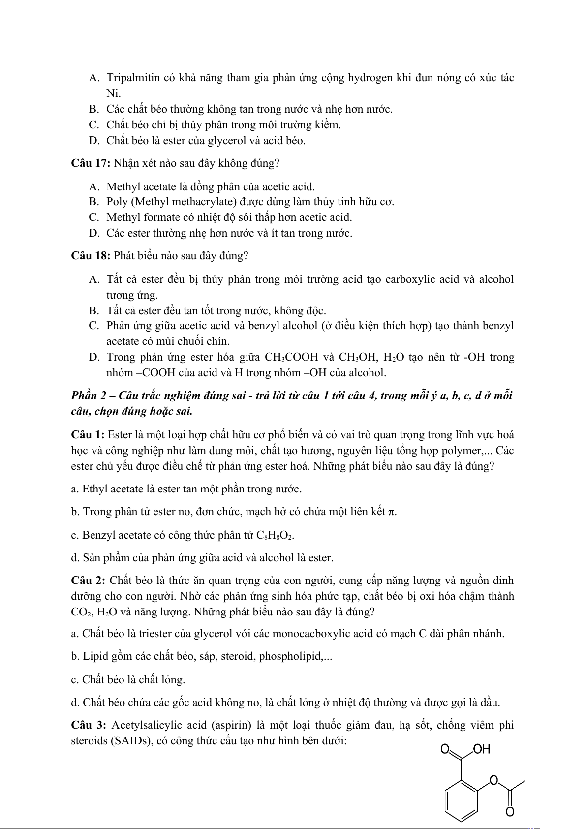 Câu 1: Ester là một loại hợp chất hữu cơ phổ biến và có vai trò quan trọng trong lĩnh vực hoá